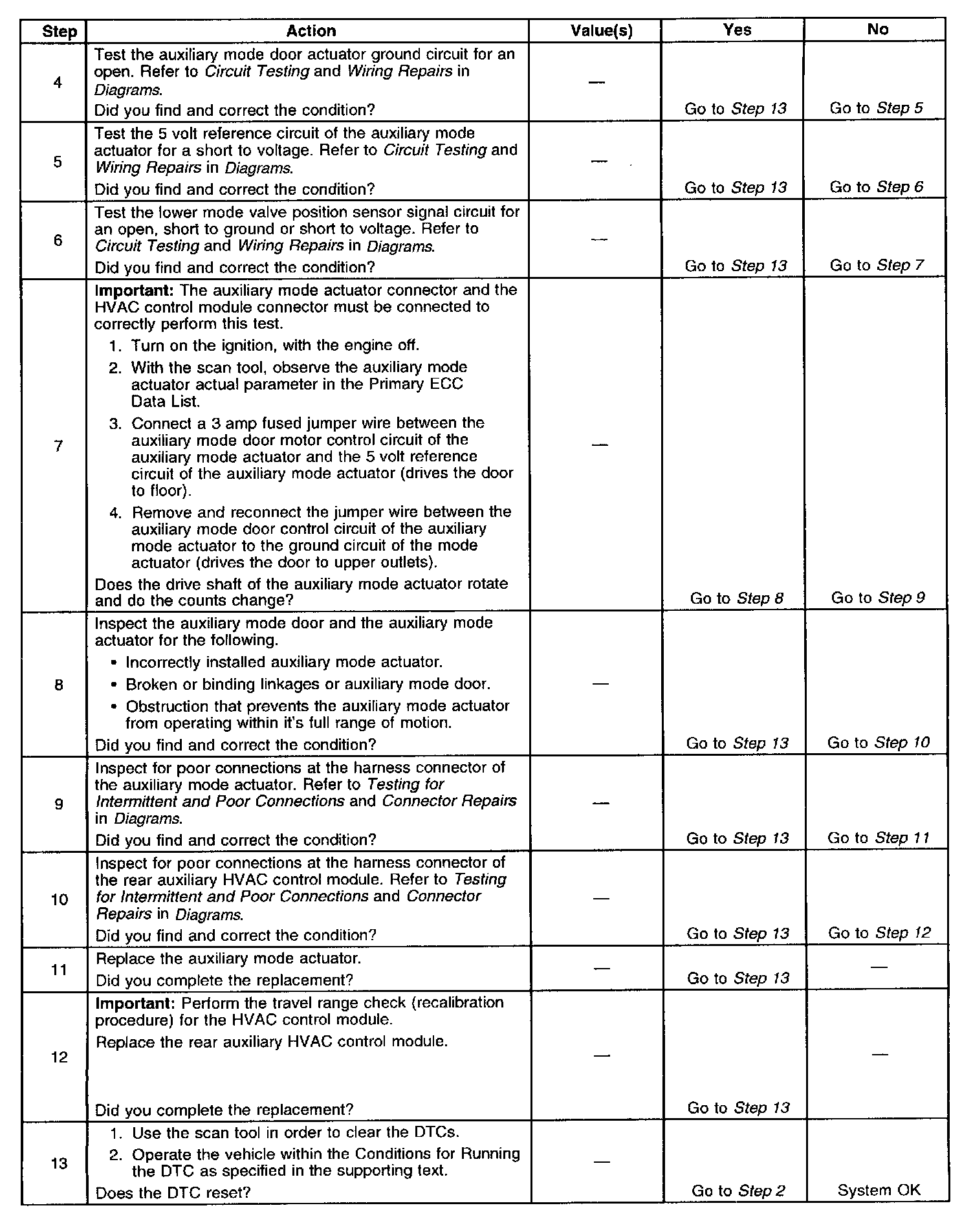 The auxiliary mode actuator is an electronic device that incorporates a stepper motor and feedback potentiometer. The rear auxiliary HVAC control module controls the auxiliary mode door position by sending a control signal to the actuator. The signal's value is dependent upon the desired mode selected by the vehicle occupants. As the actuator moves, the potentiometer produces the actual door position signal that is sent to the rear auxiliary HVAC control module. The rear auxiliary HVAC control module continues to command the actuator to move until the desired and actual values are equal. The door directs airflow through the outlets as selected by the vehicles occupants.