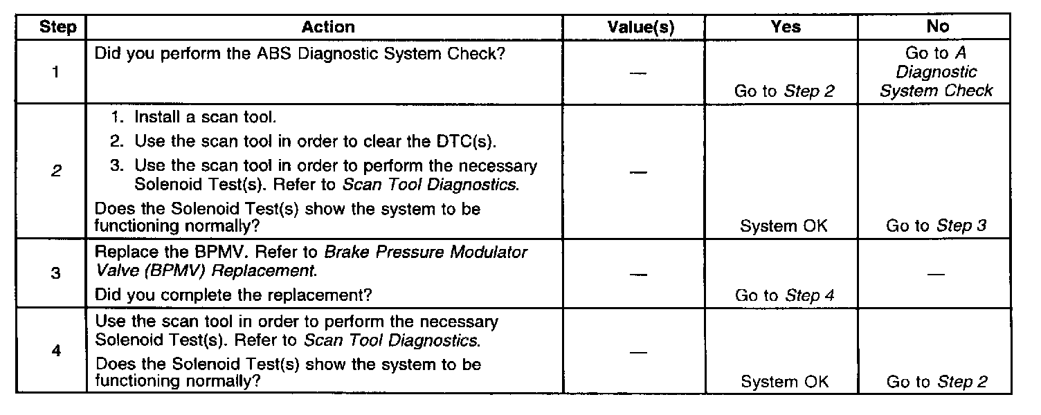 2. Using the scan tool to perform solenoid tests determines if there is a mechanical malfunction(s) inside the BPMV (i.e.; a dump valve(s) stuck closed or an isolation valve(s) stuck open). Perform Dump Valve Tests for DTC C0269 or Isolation Valve Tests for DTC C0274.