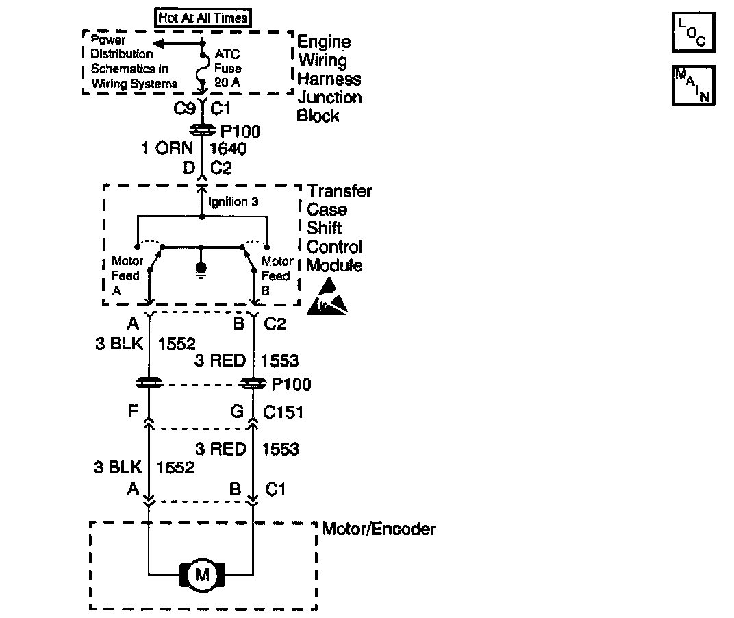The transfer case motor is a bi-directional, permanent magnet, D.C. motor. When energized, (through Motor Feed A or Motor Feed B, the ground is provided by the opposing Motor Feed circuit and then grounded through the transfer case shift control module ground circuit), the motor, through a series of gears, rotates the sector shaft which moves the mode and range forks to shift the transfer case between 4H, AUTO 4WD, 2H, N, and 4L ranges. While the transfer case motor is energized the transfer case shift control module also energizes the solenoid for the transfer case lock. The motor lock is disabled (locking action released) and free turning of the transfer case motor and sector shaft is then allowed.