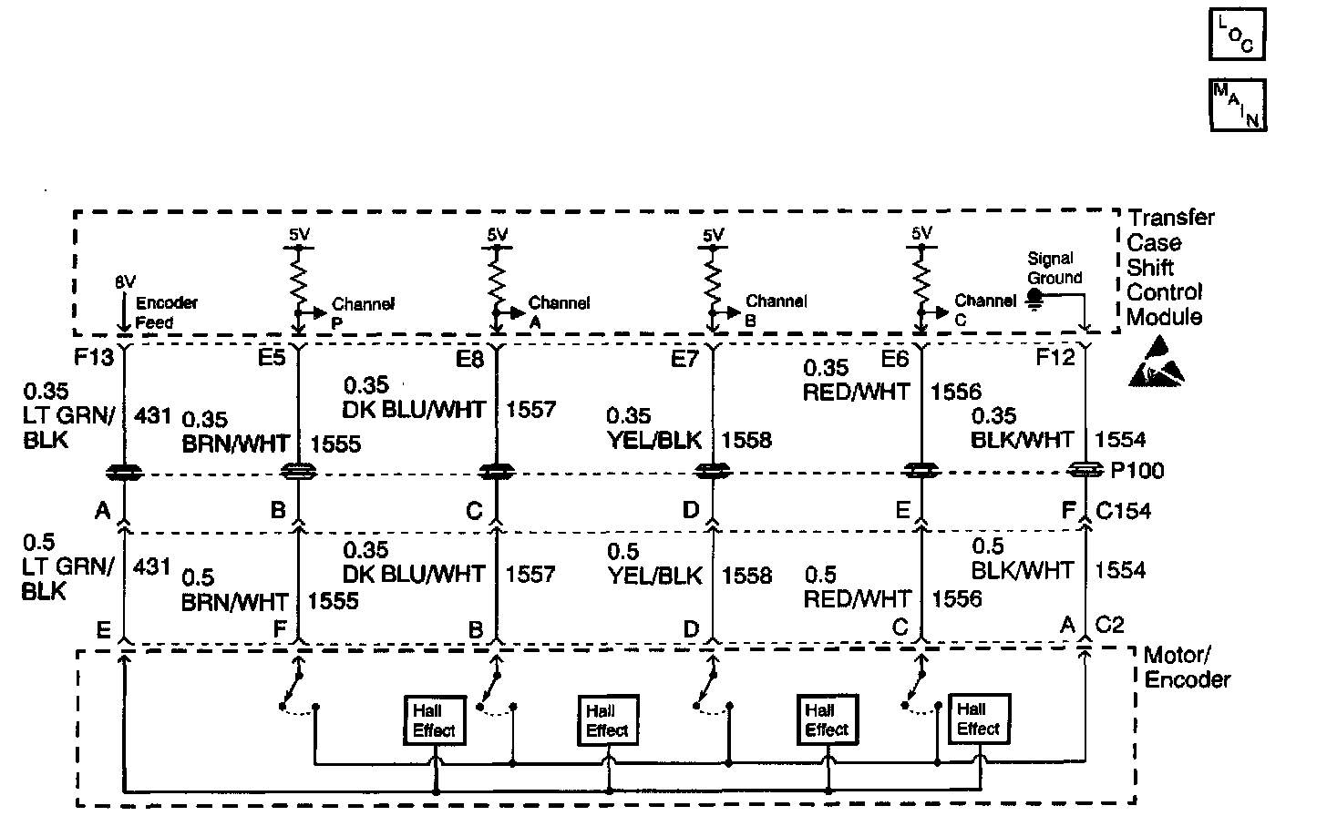 The transfer case encoder is a switch that converts a shaft position, representing a mode or range position, into electrical signals for use by the transfer case shift control module. The encoder houses 4 Hall effect sensors that are used for channels P, A, B, and C. These sensors provide a path to ground, when a magnet, (part of the Motor Encoder), passes over them.