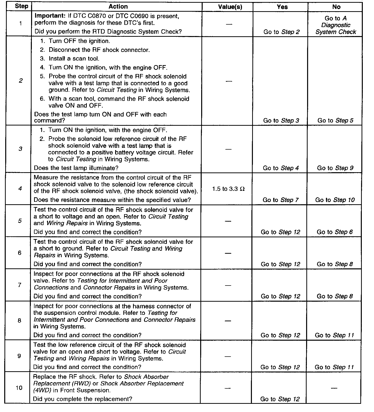 The suspension control module performs a test on each shock solenoid valve during both the ON and OFF states.