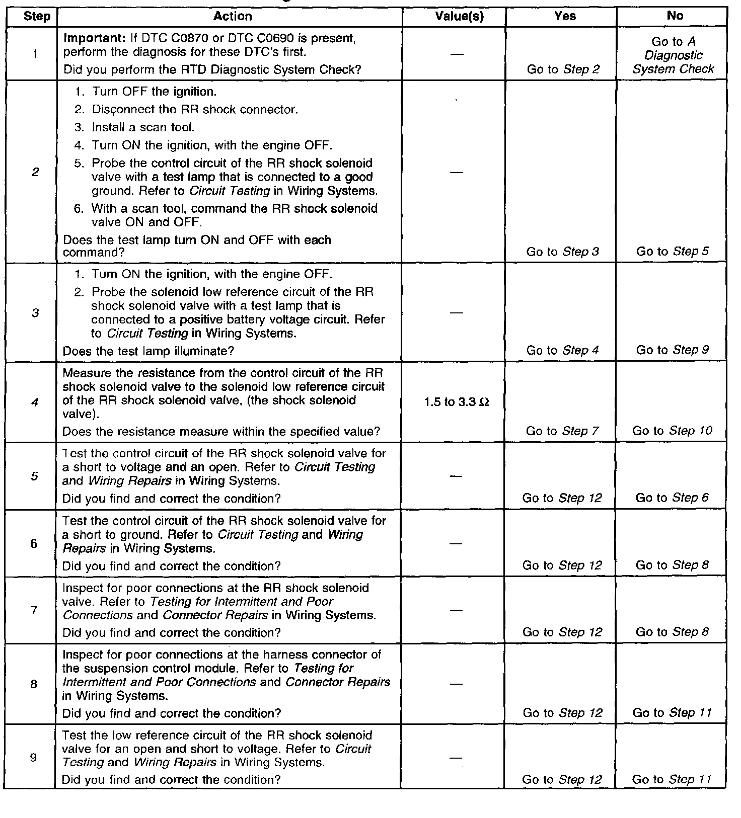 5. Tests the control circuit to the RR shock solenoid valve for an open and short to voltage.