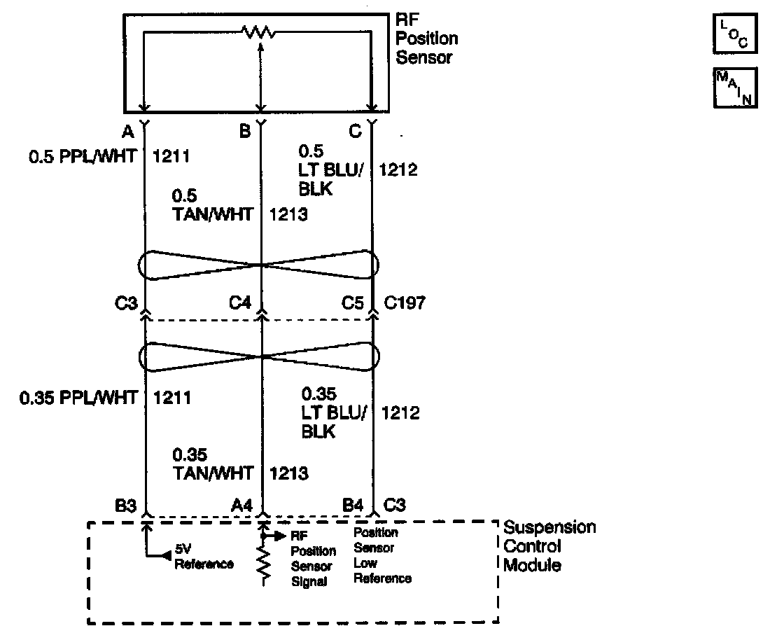 The position sensor provides an analog signal voltage between 0.5 and 4.5 volts to the suspension control module. This signal voltage represents the wheel's position relative to the body. The suspension control module provides a 5.0 volt reference and a low reference to the sensor. Conditions for Running the DTC Under normal driving conditions. Vehicle speed greater than 0 kph (0 mph). Conditions for Setting the DTC The suspension control module senses a position sensor signal voltage below 0.5 volts or above 4.5 volts.