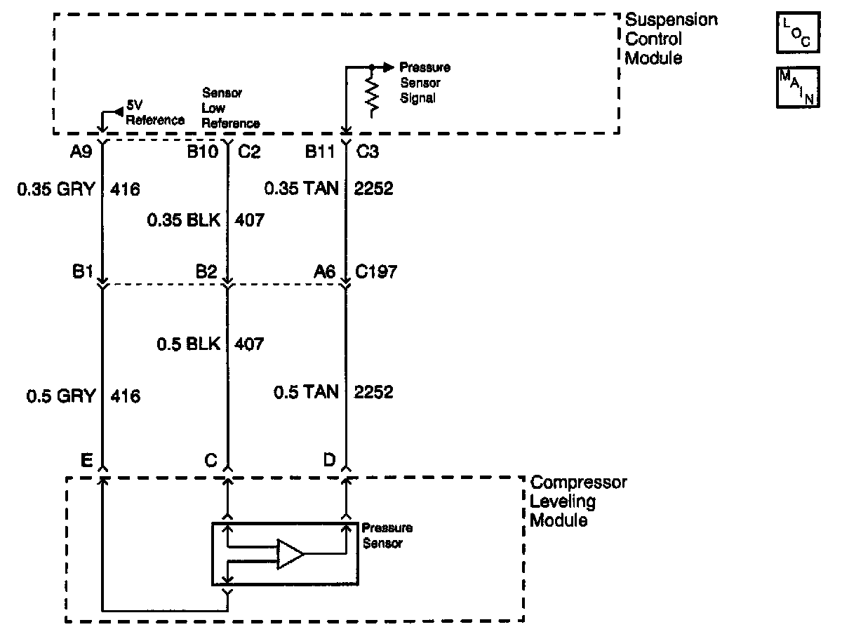The suspension control module supplies 5 volts to the RTD air pressure sensor. The pressure sensor uses this reference voltage to produce an analog output of approximately. 0.15 to 4.85 volts. The signal voltage is a reference of the air pressure in the rear leveling system.
