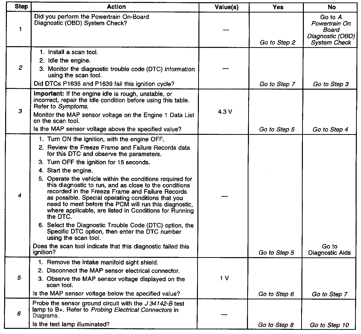 2. If DTCs P1635 and P1639 set at the same time, this indicates that the MAP sensor circuit is shorted to a voltage.