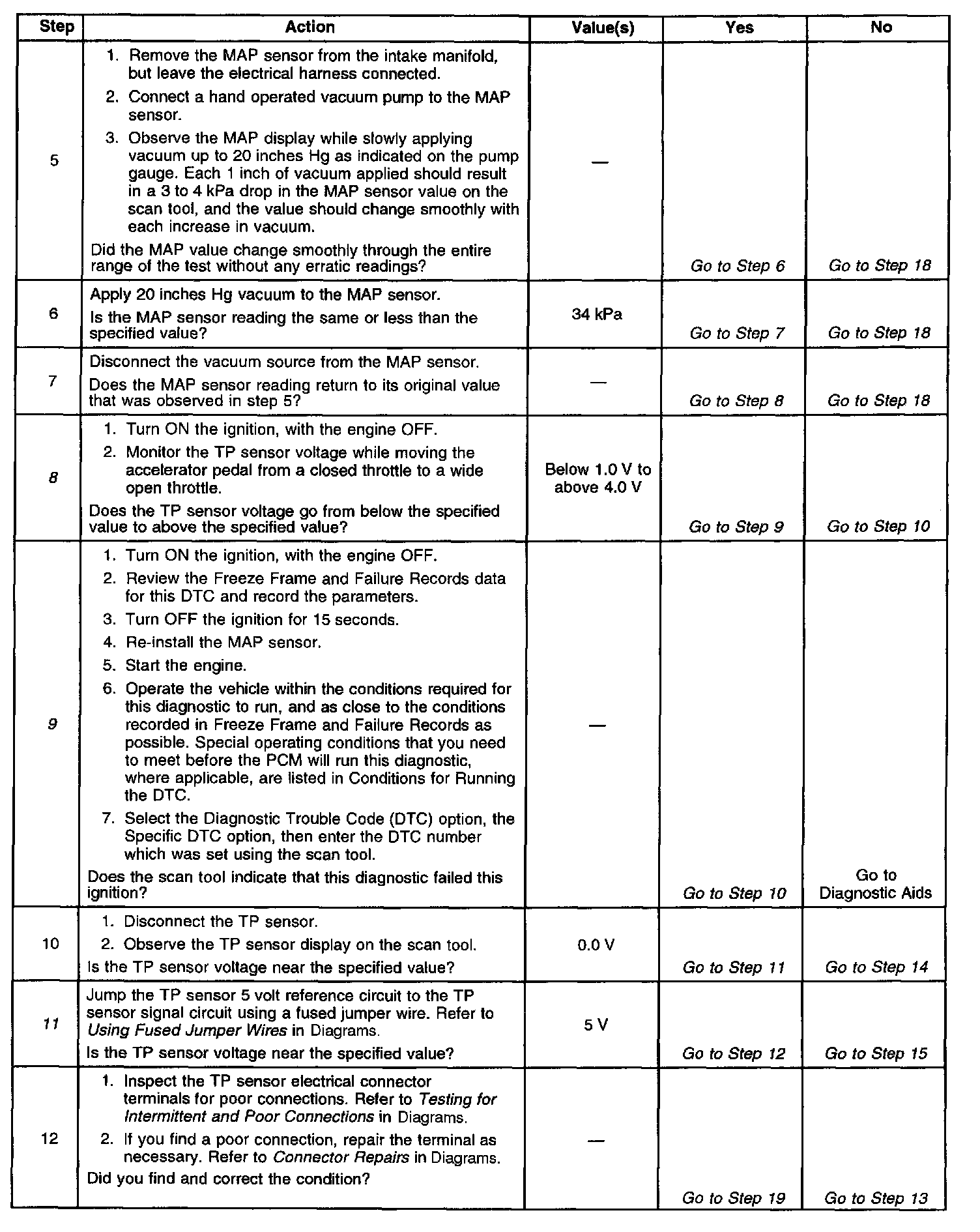 11. This step checks the 5 volt reference circuit, signal circuit, and the PCM. If the scan tool displayed 5 volts, the TP sensor 5 volt reference and the TP sensor signal circuits are OK.