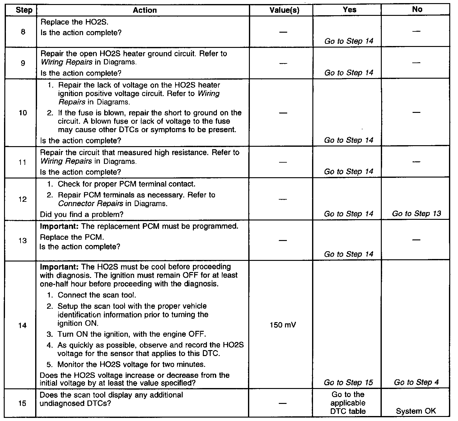 The numbers below refer to the step numbers on the diagnostic table.