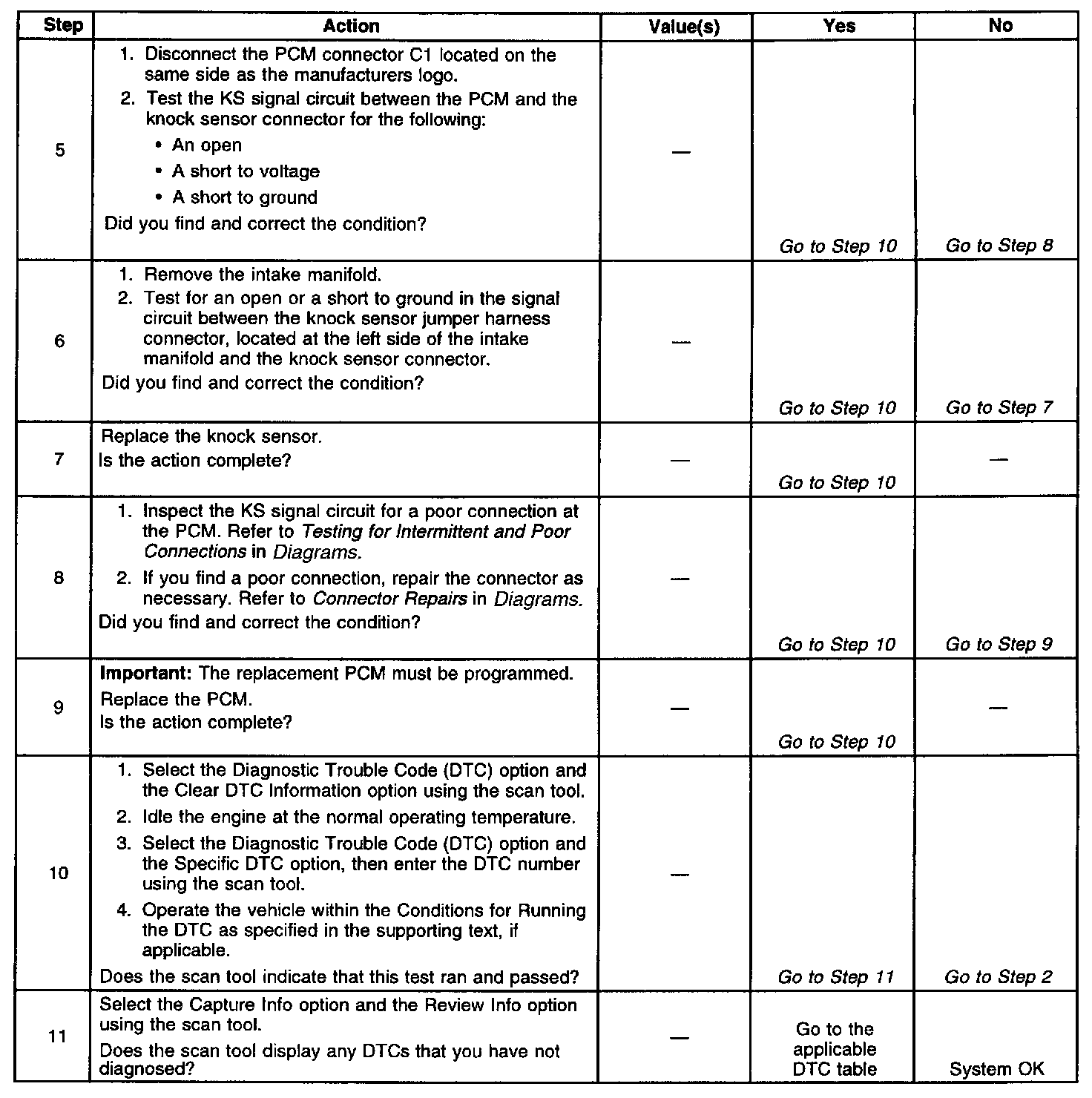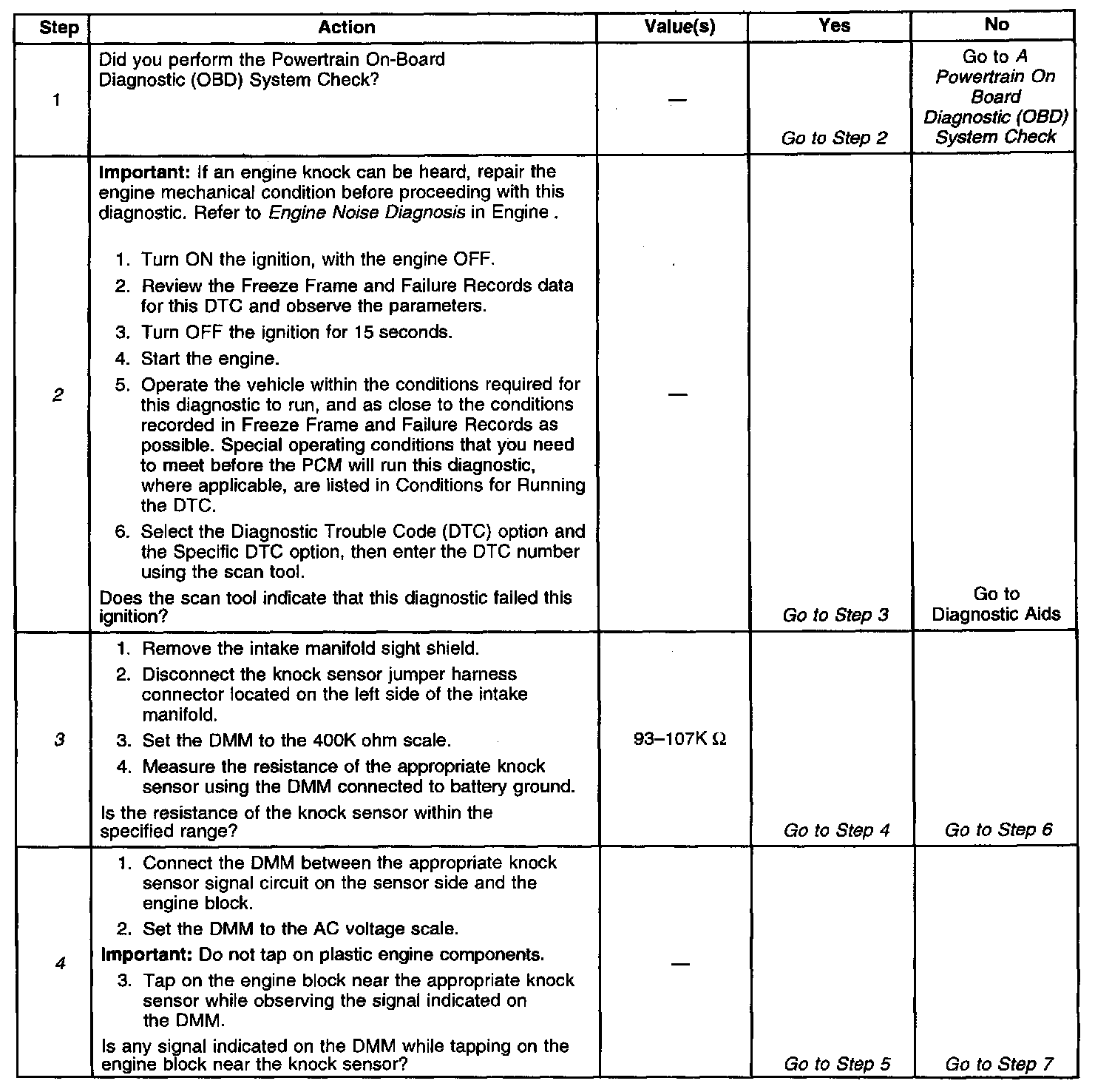 2. This verifies the malfunction is present. The scan tool will display DTC Ran=Yes and Pass=Int if the failure is intermittent. This indicates the diagnostic passed this ignition cycle and failed this ignition cycle. At this point the resistance of the knock sensors should be verified to be in the correct range. If the knock sensor resistances are correct, inspect the KS system wiring connections. When inspecting the KS system connections, start at the KS system jumper harness connector located on the left side of the intake manifold. Then inspect the connections at the PCM. Refer to the wiring schematic for the correct connector and terminal. Then inspect the connections at the appropriate knock sensor. Failure Records data does not include the parameter KS activity, however other parameters may aid in locating the conditions under which an intermittent occurred.