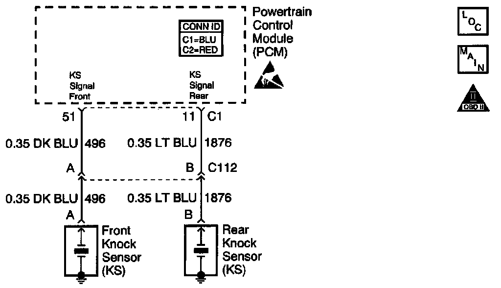 The Knock Sensor (KS) system detects engine pre-detonation. The Powertrain Control Module (PCM) retards the spark timing based on the signals from the knock sensors. The knock sensors produce an AC voltage when specific frequencies are detected. The knock sensor voltages are an input to the PCM. The amount of AC voltage produced is proportional to the intensity of the knock.