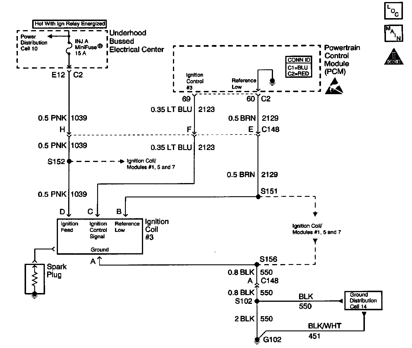 The ignition system on this engine uses an individual ignition coil for each cylinder. The Powertrain Control Module (PCM) controls the ignition system operation. The PCM controls each coil using one of eight Ignition Control (IC) circuits. The PCM commands the IC circuit low when a spark event is requested. This causes the IC module to energize the ignition coil to create a spark at the spark plug. Each ignition coil has the following circuits: