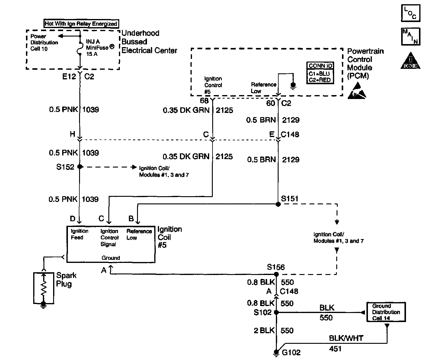 The ignition system on this engine uses an individual ignition coil for each cylinder. The Powertrain Control Module (PCM) controls the ignition system operation. The PCM controls each coil using one of eight Ignition Control (IC) circuits. The PCM commands the IC circuit low when a spark event is requested. This causes the IC module to energize the ignition coil to create a spark at the spark plug. Each ignition coil has the following circuits: