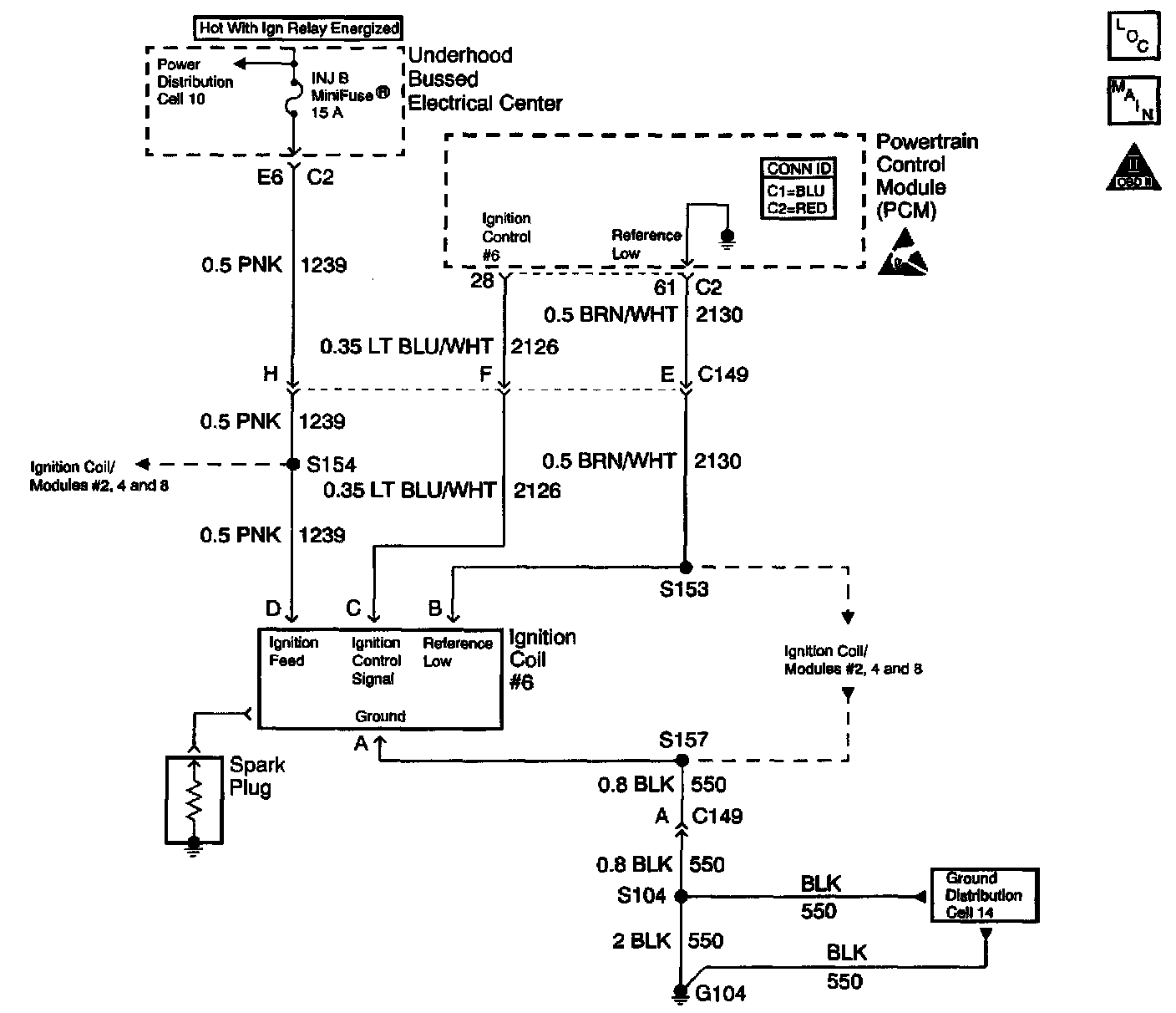 The ignition system on this engine uses an individual ignition coil for each cylinder. The Powertrain Control Module (PCM) controls the ignition system operation. The PCM controls each coil using one of eight Ignition Control (IC) circuits. The PCM commands the IC circuit low when a spark event is requested. This causes the IC module to energize the ignition coil to create a spark at the spark plug. Each ignition coil has the following circuits: