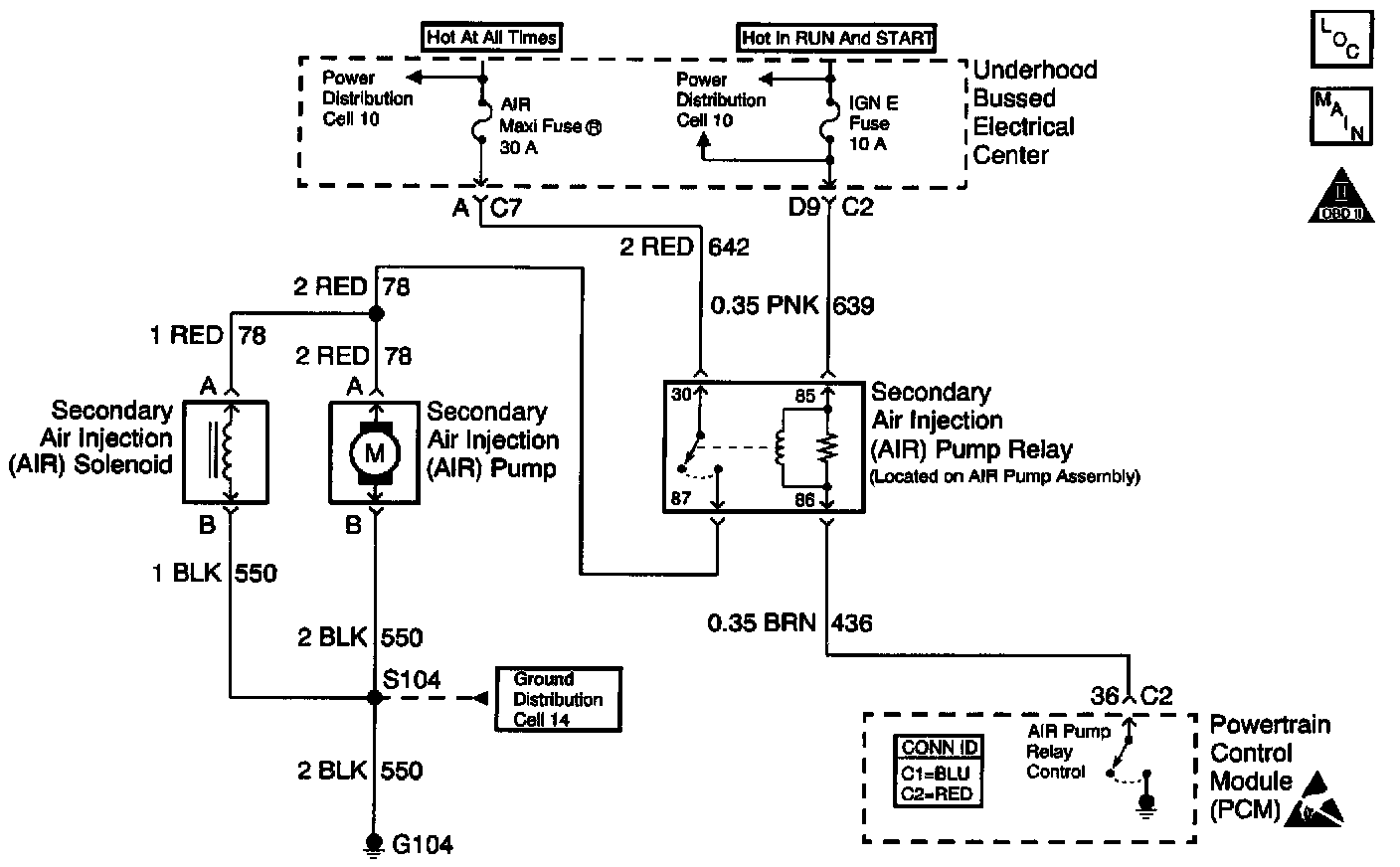 The relay controls the high current flow to the secondary Air Injection (AIR) pump and the AIR solenoid. This allows the PCM driver to only have to control the relatively low current used by the relay.