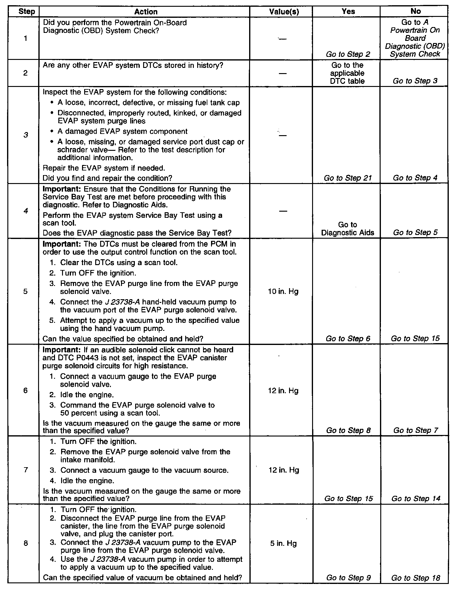 ^ An accurate indication of fuel level is required for the PCM to properly pass or fail this DTC. Always diagnose fuel level sensor DTCs before performing this DTCs diagnostic table. Always inspect for fuel level sensor DTCs stored as History.