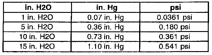 The vacuum and pressure in the EVAP system is measured in inches of water (H2O). Most gauges measure vacuum in inches of Mercury (Hg) and pressure in pounds Per Square Inch (psi). The following shows how the values compare: