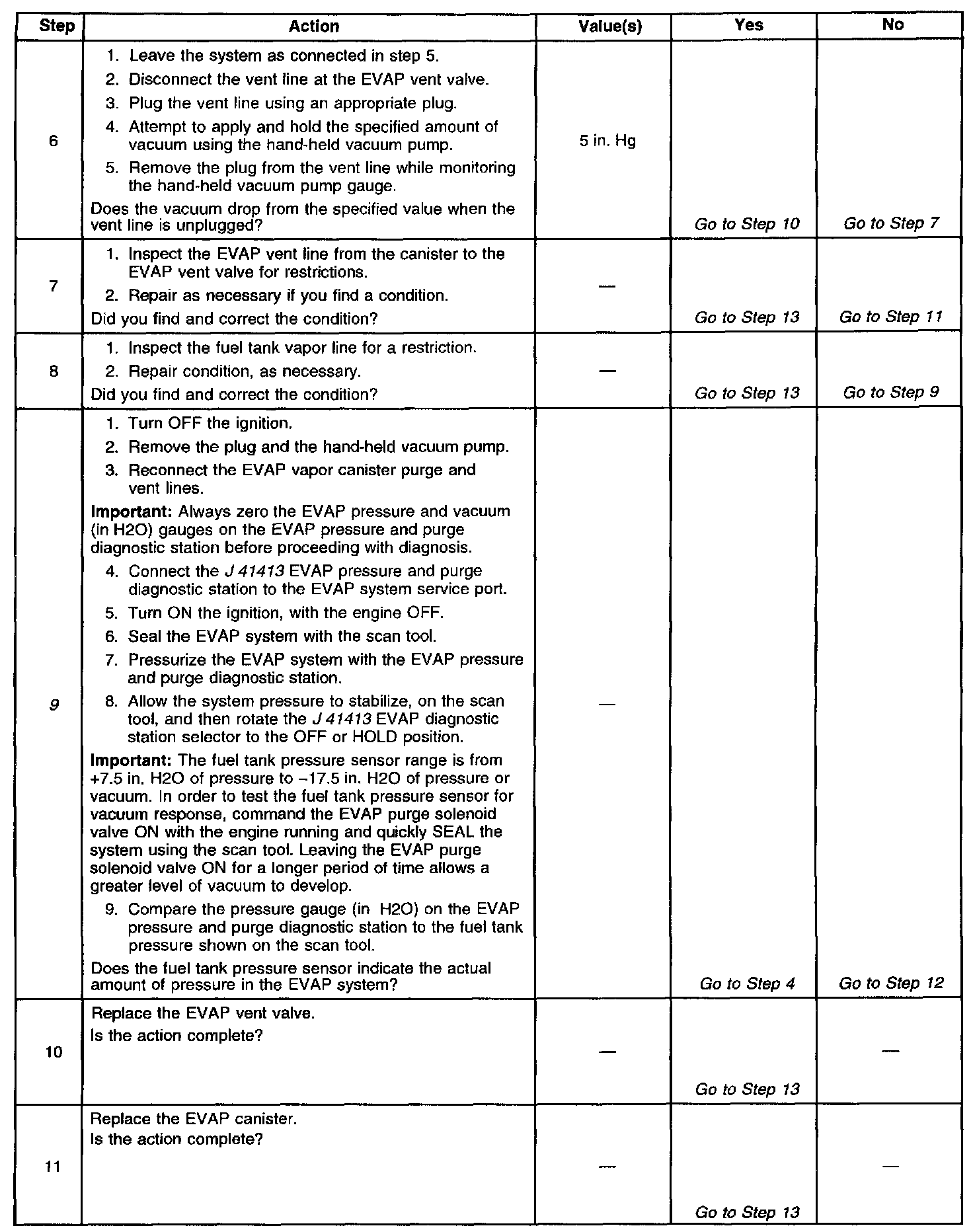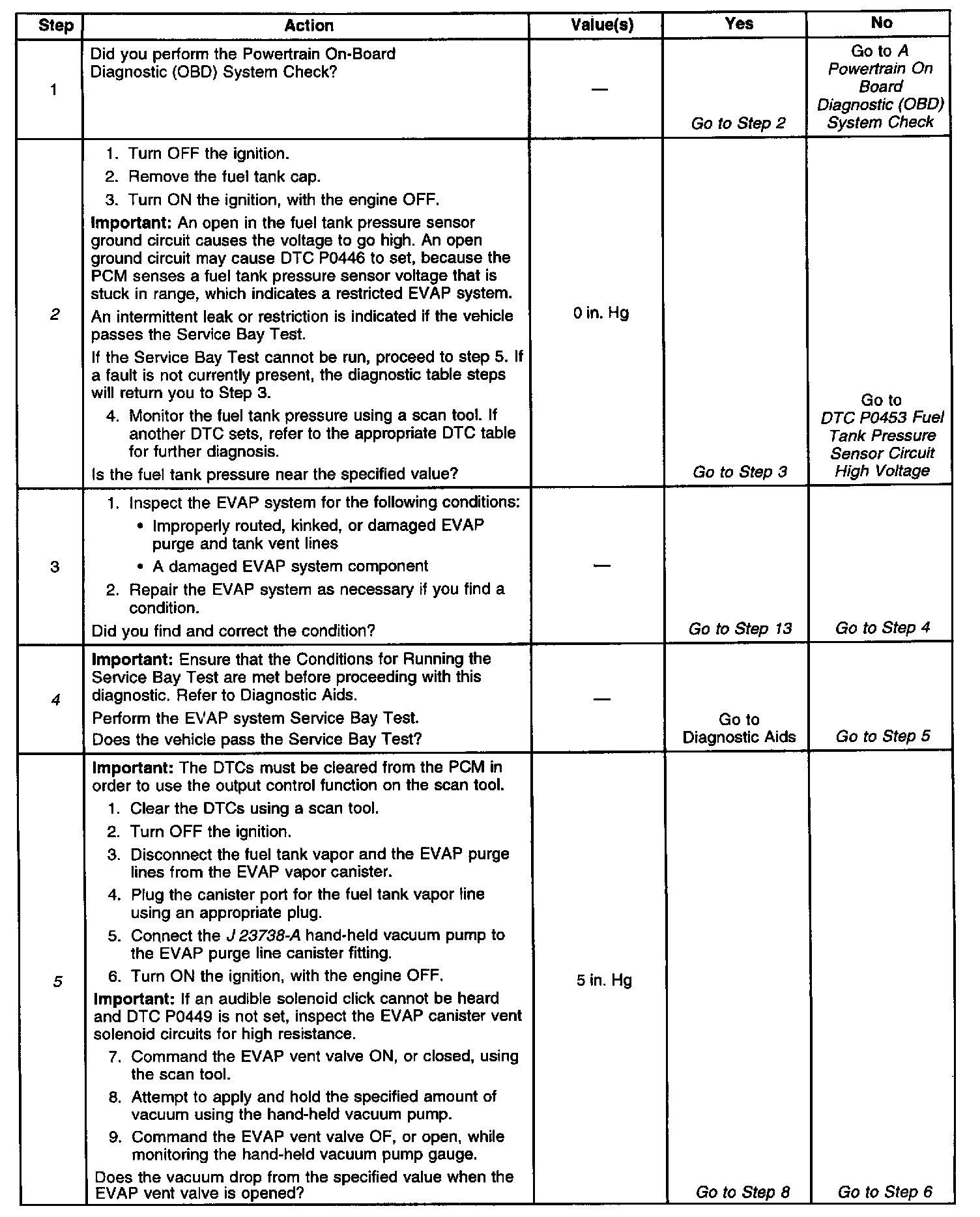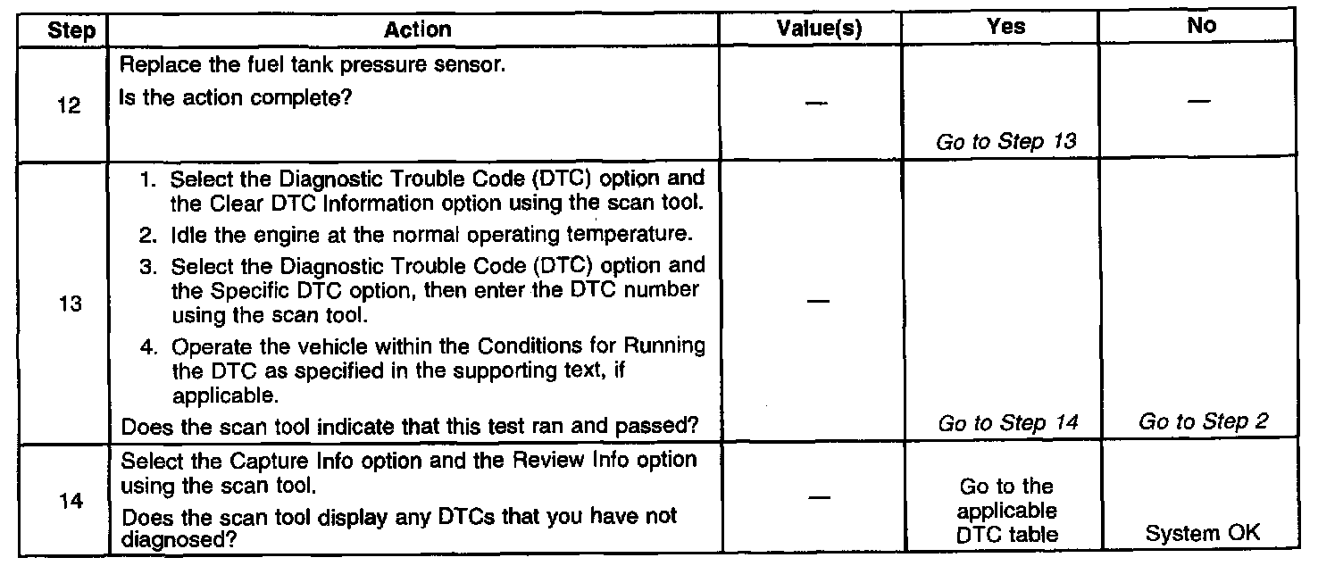 ^ An accurate indication of fuel level is required for the PCM to properly pass or fail this DTC. Always diagnose fuel level sensor DTCs before performing this DTCs diagnostic table. Always inspect for fuel level sensor DTCs stored as History.