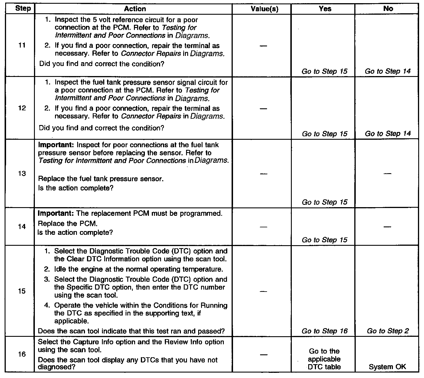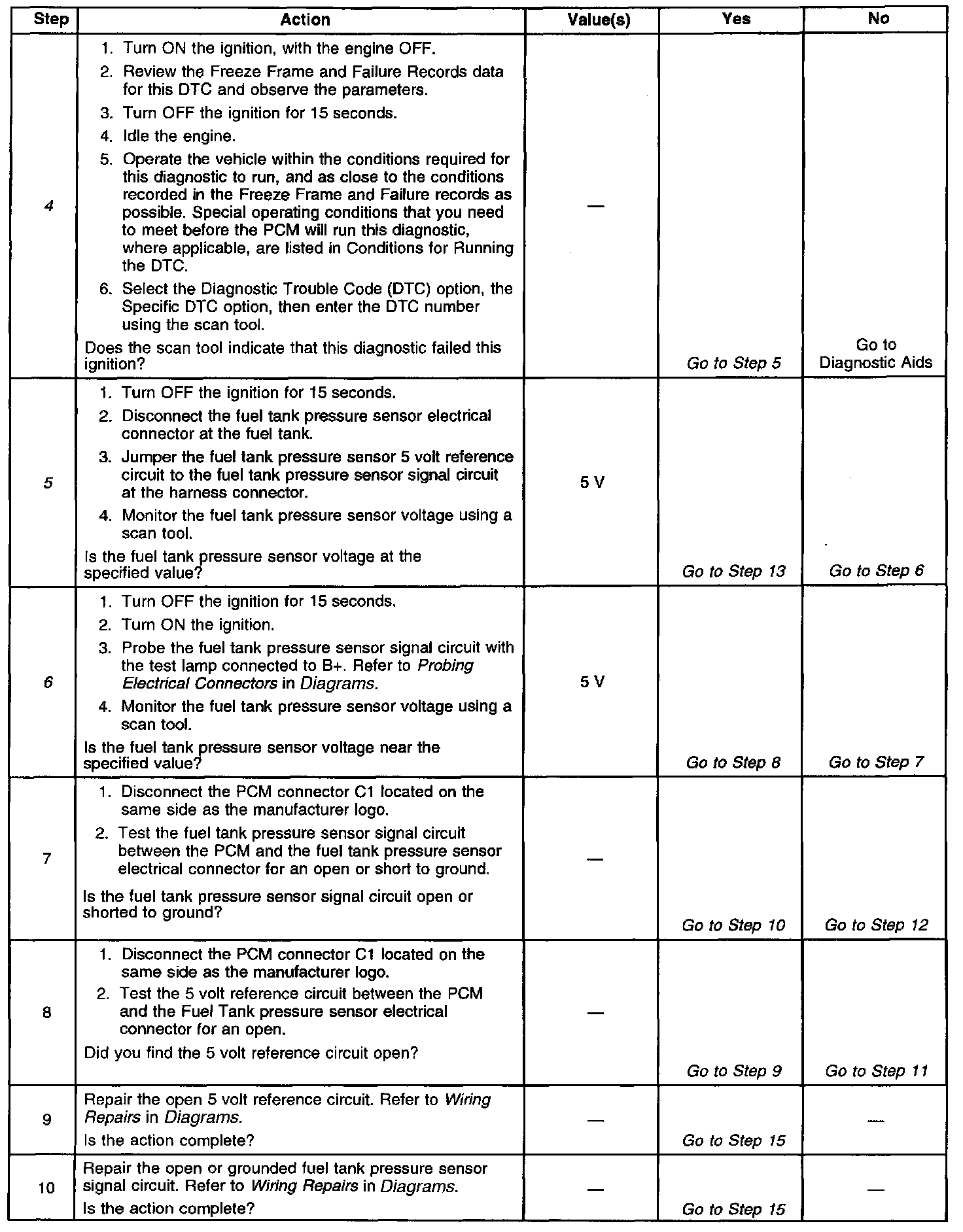 The Powertrain Control Module (PCM) provides a 5 volt reference and a ground. The fuel tank pressure sensor signal varies between ground and 5 volts as the fuel tank pressure varies. The fuel tank pressure sensor voltage increases as the fuel tank pressure decreases, such as negative pressure, or vacuum. The fuel tank pressure sensor voltage decreases, such as positive pressure, or low voltage, as the fuel tank pressure increases. The PCM uses the fuel tank pressure sensor voltage for Evaporative Emission (EVAP) system leak detection. This DTC sets when the fuel tank pressure sensor signal goes below a predetermined value.