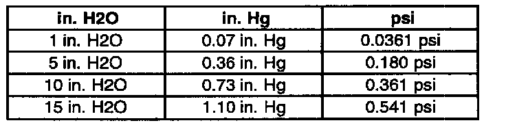 The vacuum and pressure in the EVAP system is measured in inches of Water (H2O). Most gauges measure vacuum in inches of Mercury (Hg) and pressure in pounds Per Square Inch (psi). The following shows how the values compare: