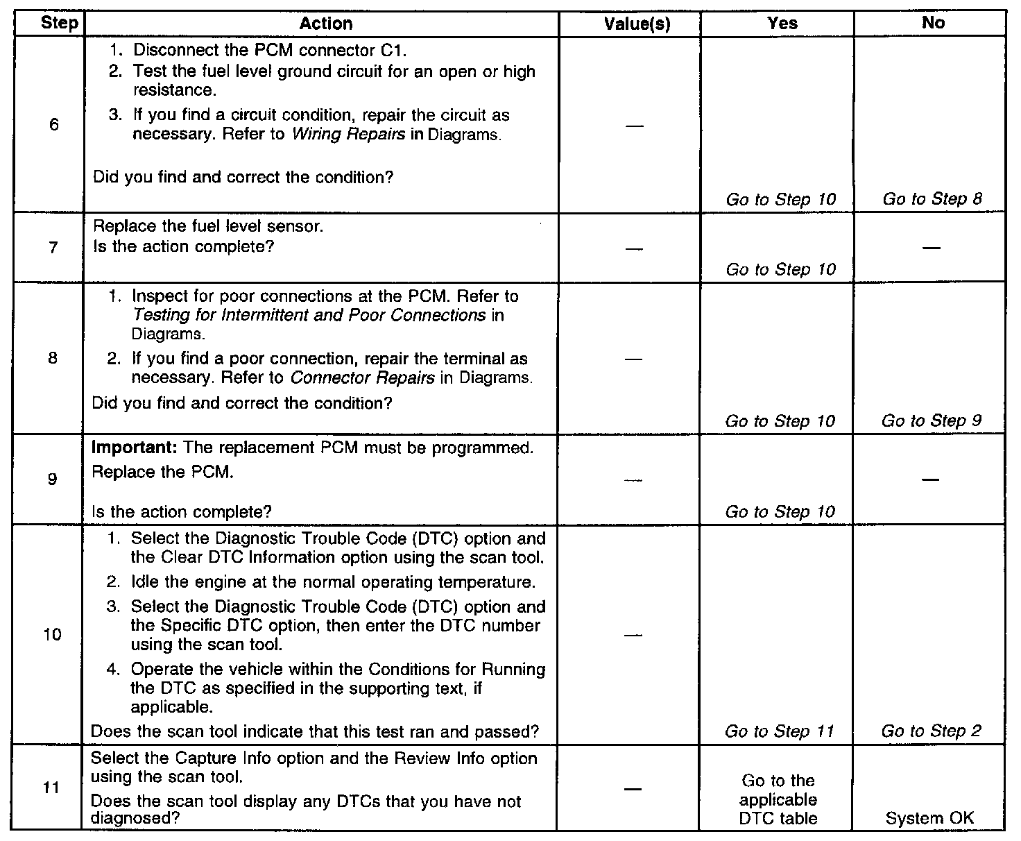 Depending on the current fuel level, it may be difficult to locate a malfunctioning sending unit. The malfunction may only occur when the fuel level is full or near empty. The fuel sending unit may need to be removed for further diagnosis. A fuel level sensor that has an intermittent condition causes this DTC to set. Remove the fuel level sensor. Refer to Fuel Level Sensor Replacement in order to test the resistance of the sensor. The resistance of the sensor should change smoothly from 40 to 250 ohms. Replace the sensor if the resistance did not change smoothly or was out of range