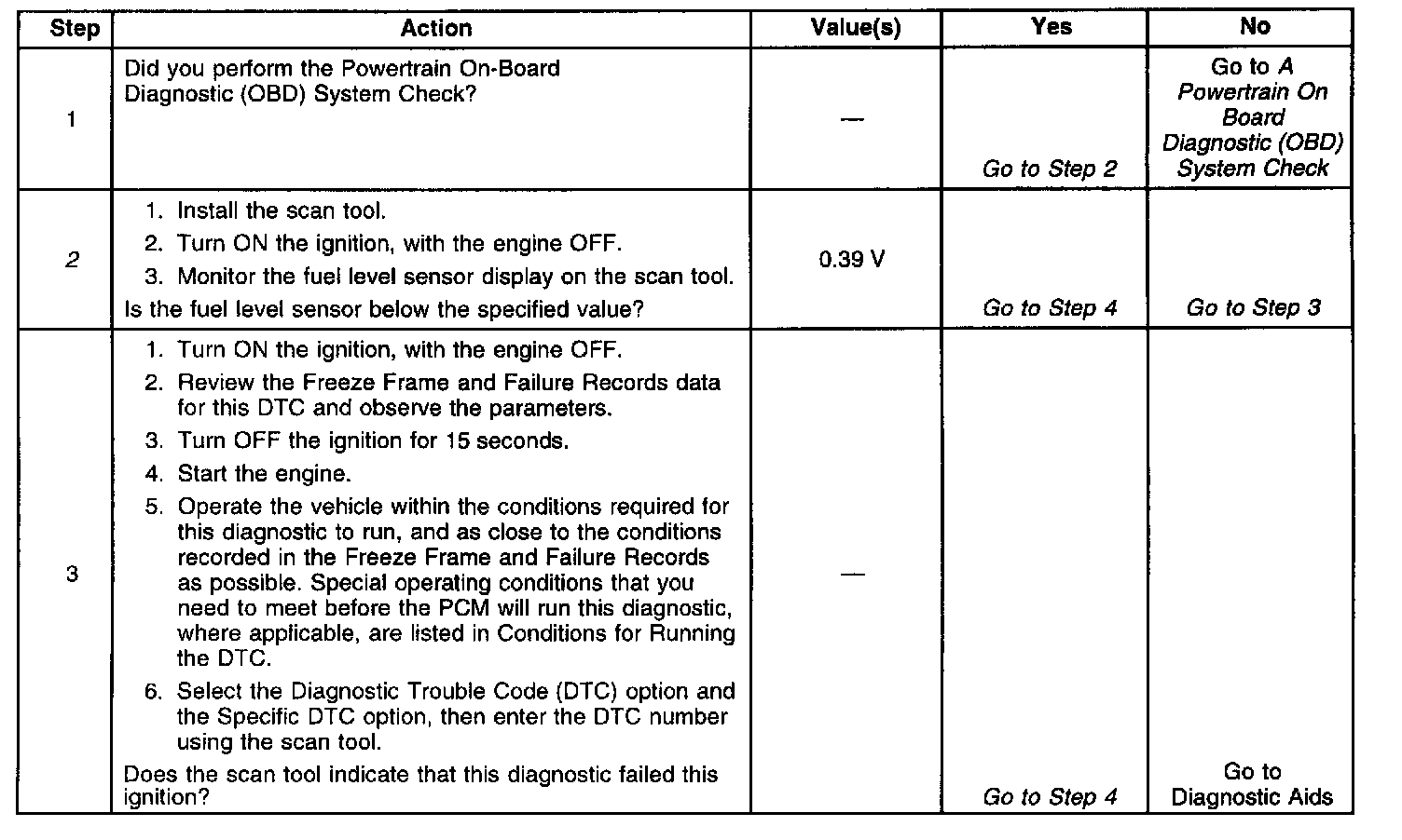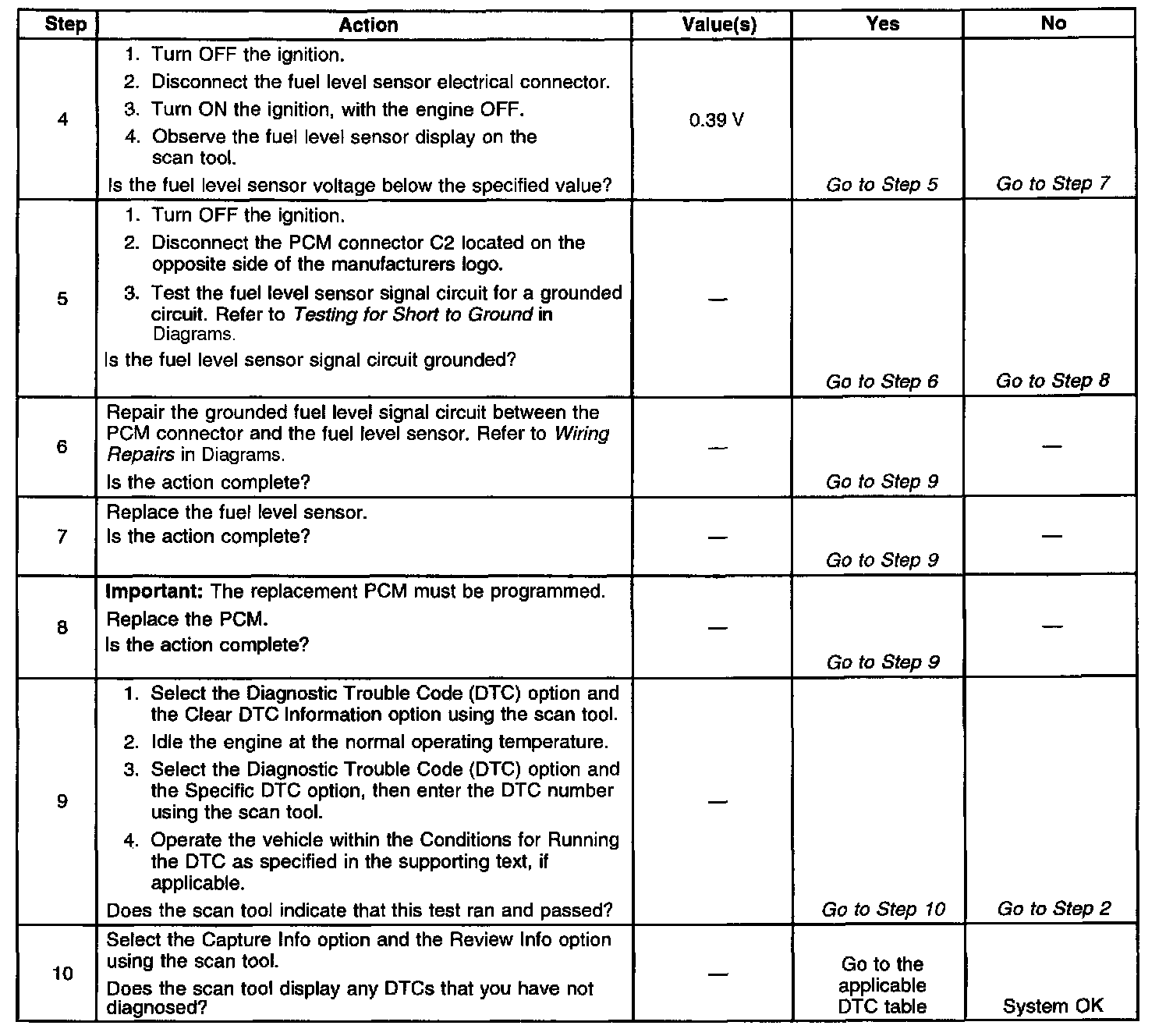 Depending on the current fuel level, it may be difficult to locate a malfunctioning sending unit. The malfunction may only occur when the fuel level is full or near empty. The fuel sending unit may need to be removed for further diagnosis. A fuel level sensor that has an intermittent condition causes this DTC to set. Remove the fuel level sensor. Refer to Fuel Level Sensor Replacement in order to test the resistance of the sensor. The resistance of the sensor should change smoothly from 40 ohms to 250 ohms. Replace the sensor if the resistance did not change smoothly or was out of range