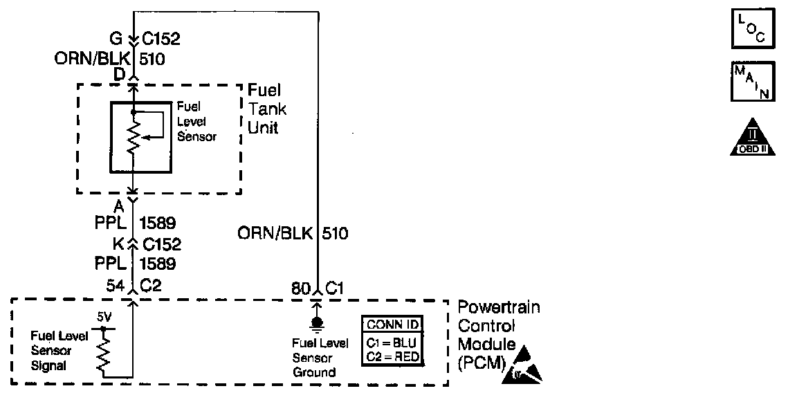 The fuel level sensor charges resistance based on fuel level. The fuel level sensor has a signal circuit and a ground circuit. The Powertrain Control Module (PCM) applies a voltage, about 5 Volts, on the signal circuit to the sensor. The PCM monitors changes in this voltage caused by changes in the resistance of the sensor to determine fuel level.