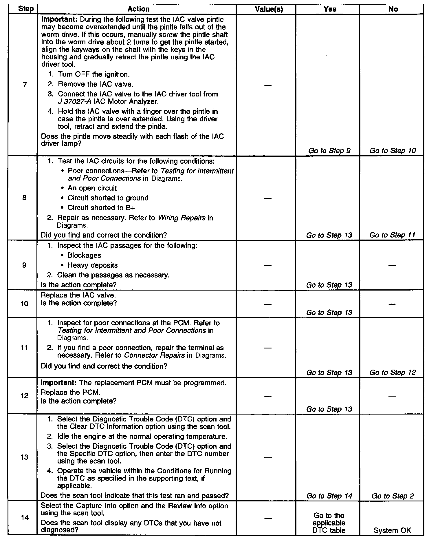 The Idle Air Control (IAC) valve is a Powertrain Control Module (PCM) controlled stepper motor located on the throttle body. The stepper motor drives a valve pintle which protrudes into a passage that bypasses the throttle plates. The PCM commands the IAC valve pintle to extend to decrease the idle speed. The bypass air flow is reduced and the idle speed decreases as the pintle approaches its seat. The PCM retracts the IAC valve pintle away from its seat to increase the idle speed. The retracting of the IAC valve pintle allows more air to bypass the throttle plates. The PCM uses the IAC system to maintain a desired idle speed. This DTC sets when the PCM detects an engine speed outside of the IACs range of control.