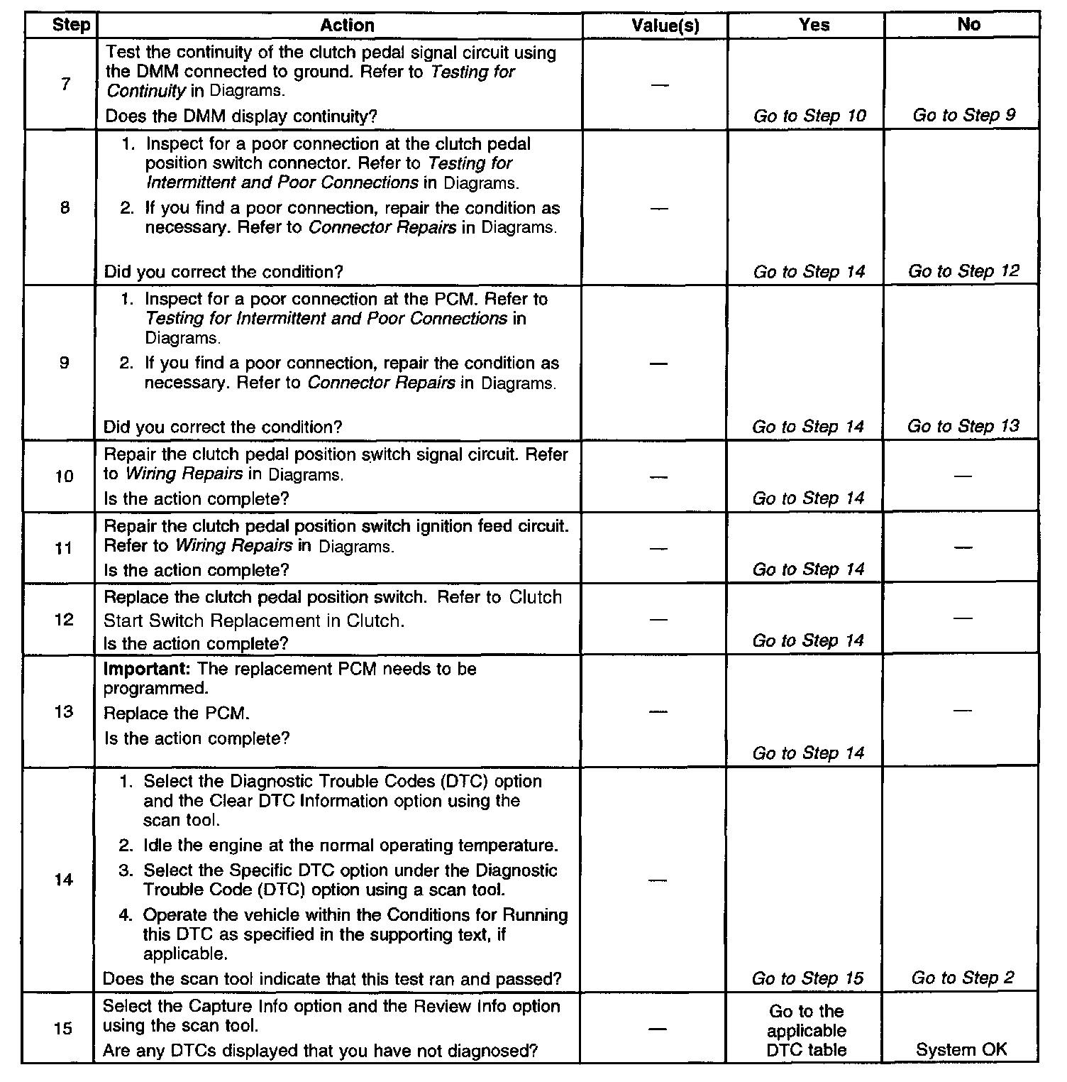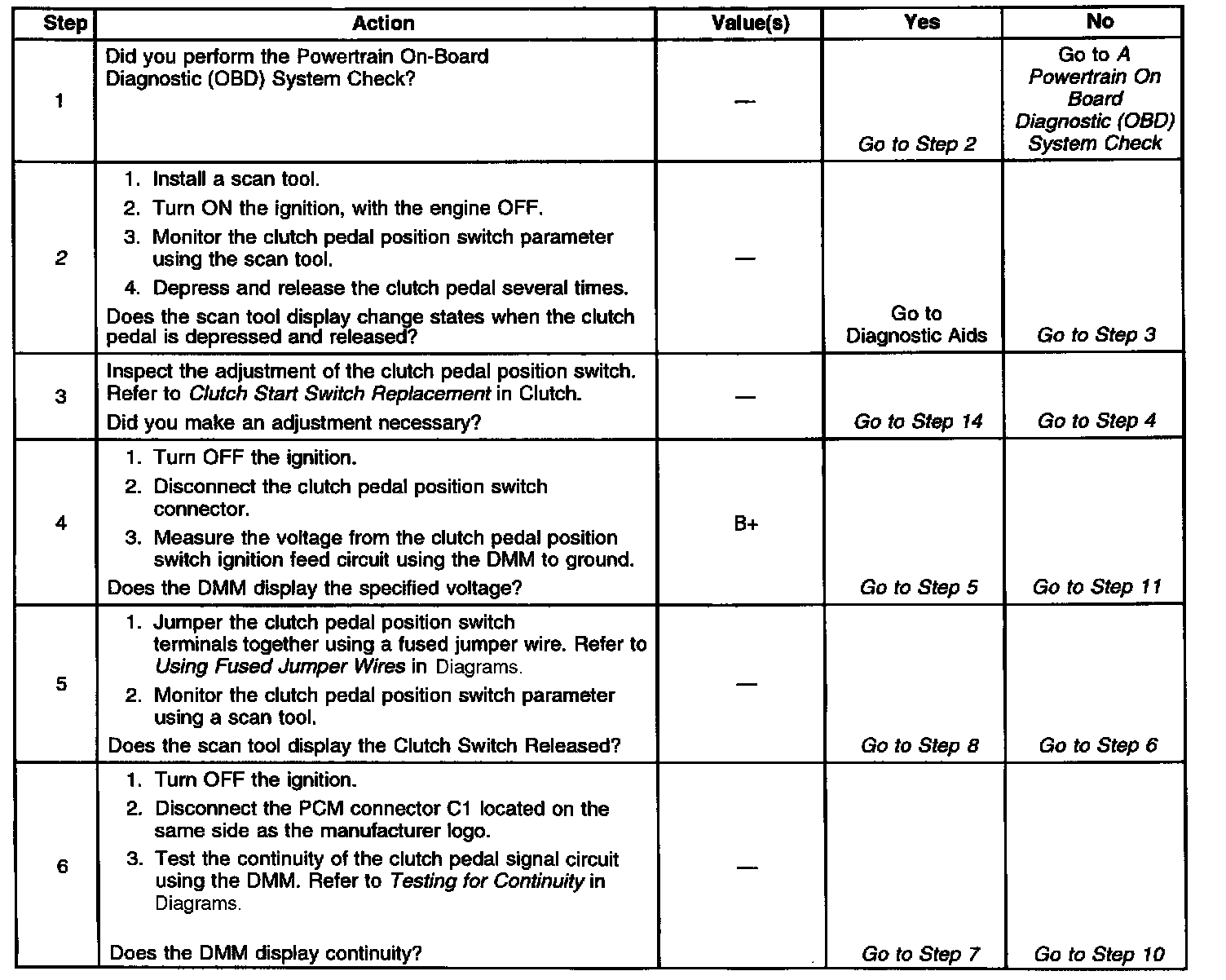 The vehicle may need to be driven to locate an intermittent condition. Monitor the clutch switch parameter on the scan tool. If the parameter changes state while driving, inspect for proper connections. For switch adjustment, refer to Clutch Start Switch Replacement in Clutch.