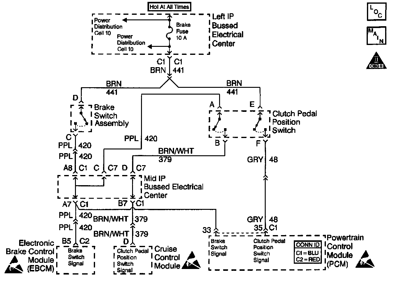 The clutch switch is a normally closed switch. The Powertrain Control Module (PCM) receives an ignition voltage on the clutch switch circuit when the clutch switch is closed. The PCM receives 0 voltage on the clutch switch circuit when the clutch switch is open. This DTC determines if the transmission clutch switch has failed by monitoring for a clutch switch transition within a range from 0-38 km/h (0-24 mph).