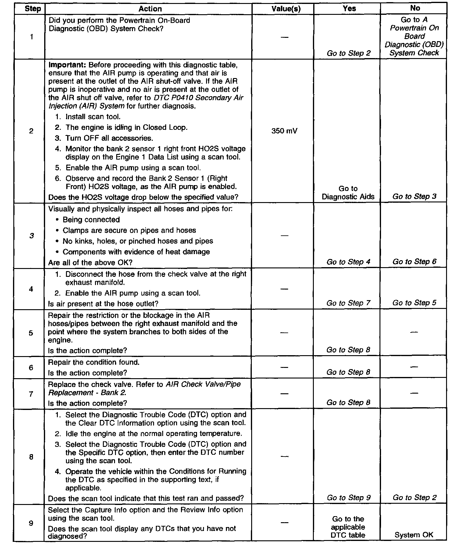 If the PCM determines that the HO2S voltages for both banks did not respond as expected during the tests, DTC P0410 sets. If only one sensor responded, the PCM sets either a DTC P1415 or P1416 to indicate on which bank the AIR system is inoperative.