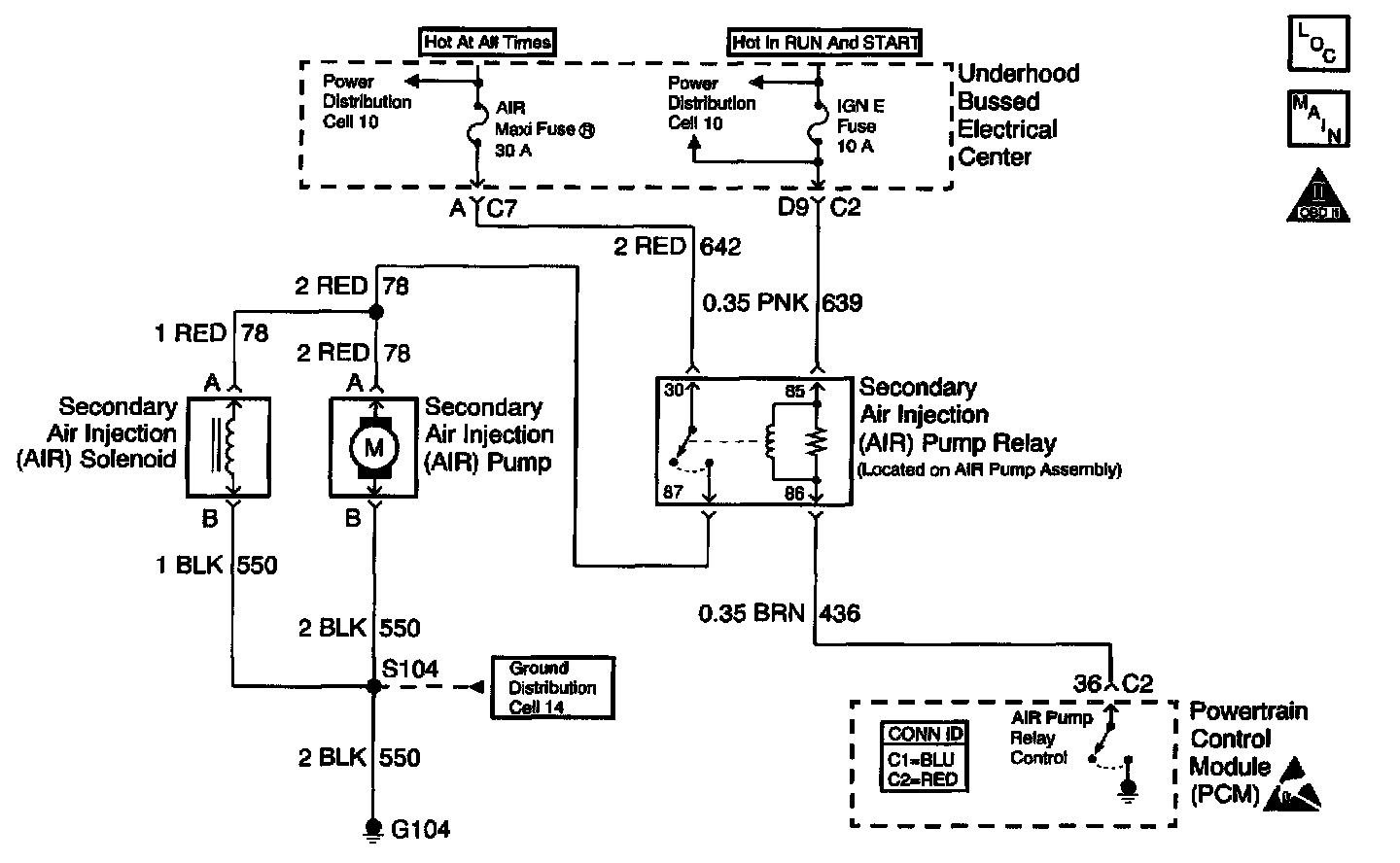An secondary Air Injection (AIR) pump is used on this vehicle to lower fail pipe emissions on start-up. The Powertrain Control Module (PCM) supplies a ground to the AIR pump relay, which energizes the AIR pump and the AIR solenoid valve. Engine vacuum is applied to the AIR Shut-off valve when the AIR solenoid is energized. The engine vacuum opens the AIR shut-off valve which allows air to flow to the exhaust manifolds.