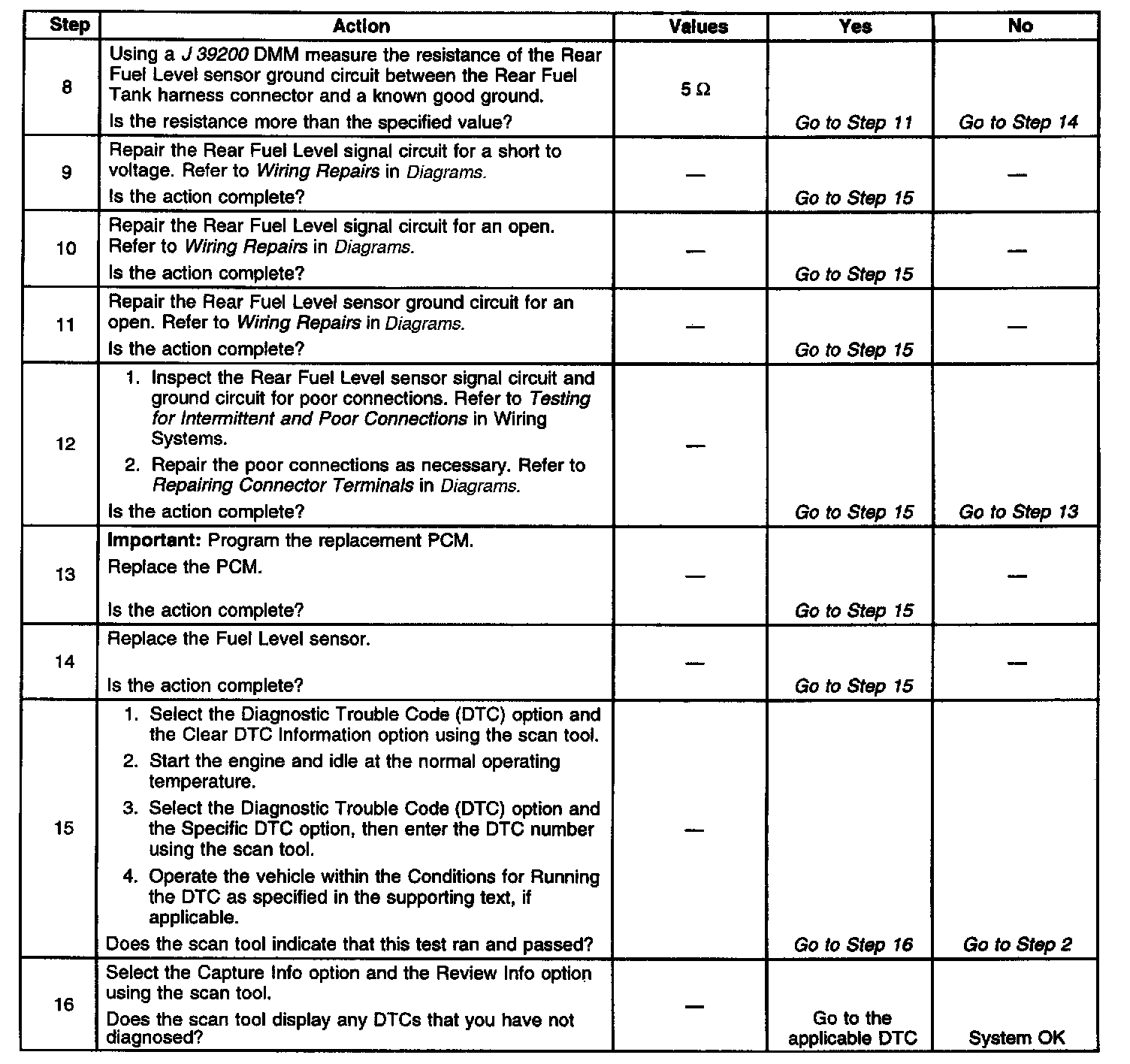 ^ Depending on the current fuel level, it may be difficult to locate a malfunctioning sending unit. The malfunction may only occur when the fuel level is full or near empty. The fuel sending unit may need to be removed for further diagnosis. A fuel level sensor that has an intermittent condition causes this DTC to set. Remove the fuel level sensor refer to Fuel Level Sensor Replacement in order to test the resistance of the sensor. The resistance of the sensor should change from 40 to 250 ohms. Replace the sensor if the resistance did not change or was out of range.