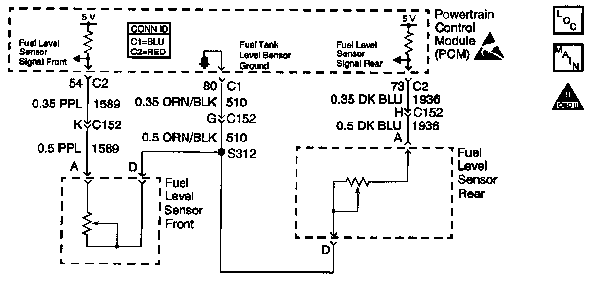 The rear fuel level sensor, mounted in the rear of the rear fuel tank, measures fuel level changes within the rear fuel tank. The fuel level sensor 2 has a signal circuit and a ground circuit.