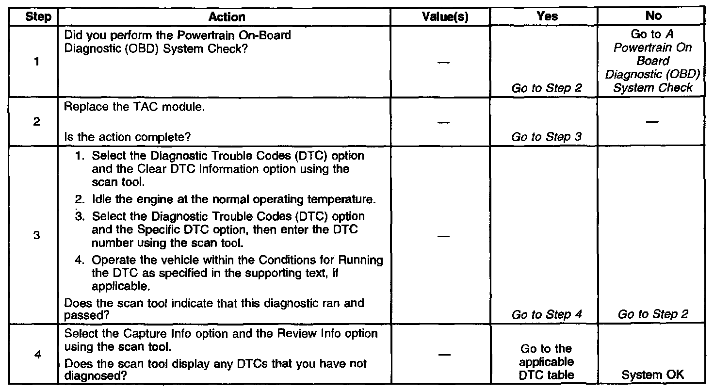 4. When a condition is detected within the TAC system, more than one TAC system related DTC may set. This is due to the many redundant tests run continuously on this system. It is possible that locating and repairing one individual condition may correct more than one DTC. Keep this in mind when reviewing captured DTC info.