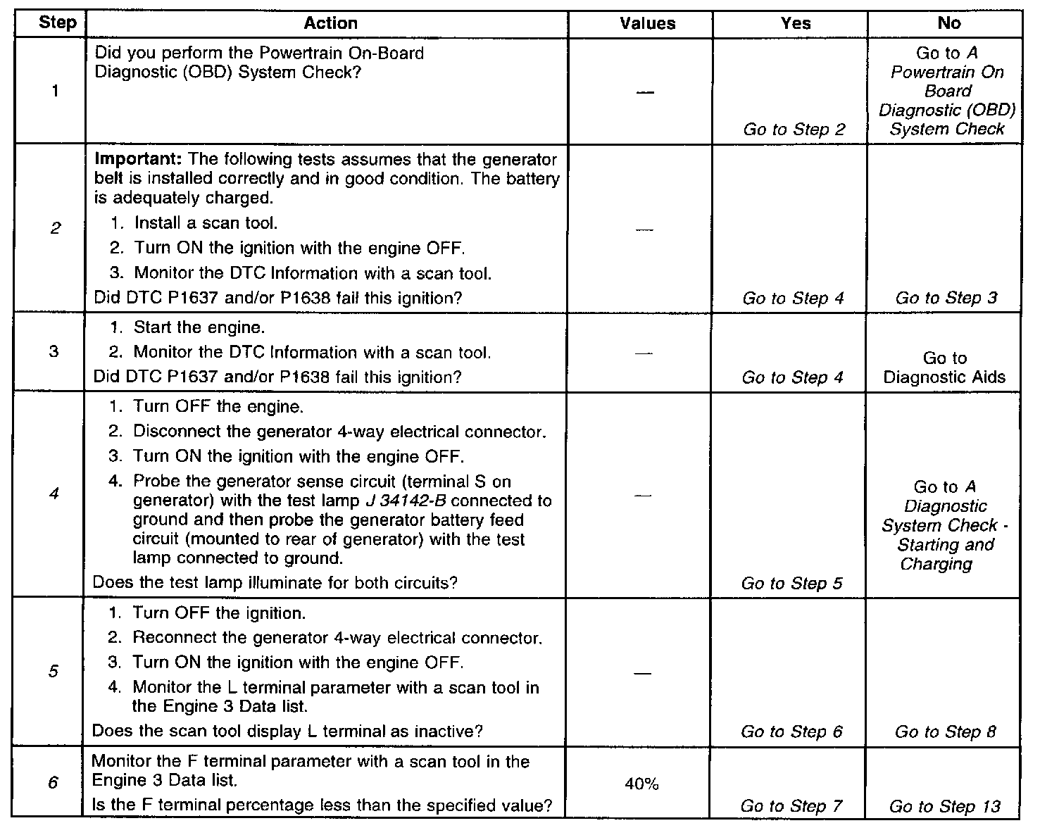 ^ DTCs P1637 and P1638 may set at the same time depending on the failure. Also, the L-terminal circuit can cause a DTC P1638 to set. This diagnostic table diagnoses both DTCs P1637 and P1638.
