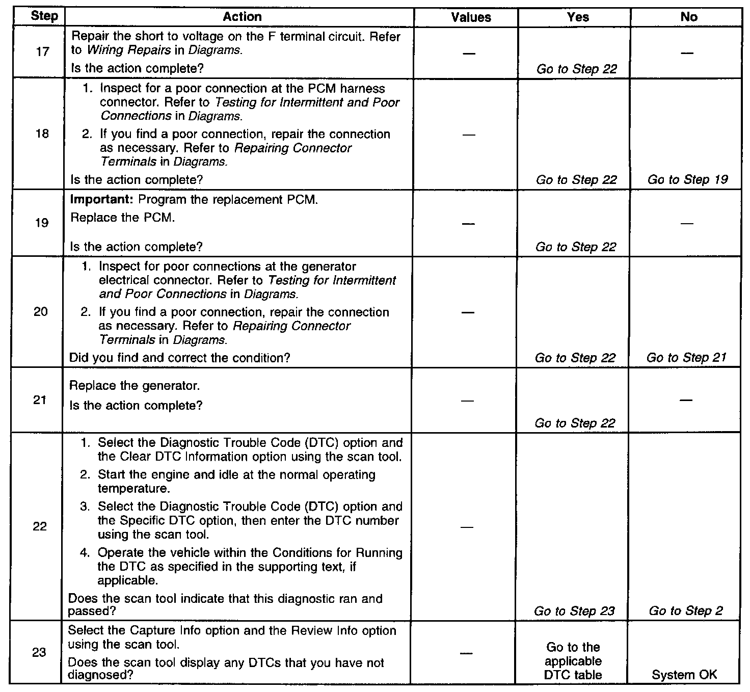 10. This step is testing the F terminal circuit for an open or a short to ground. If the F terminal parameter goes to 99 percent the condition is within the generator.