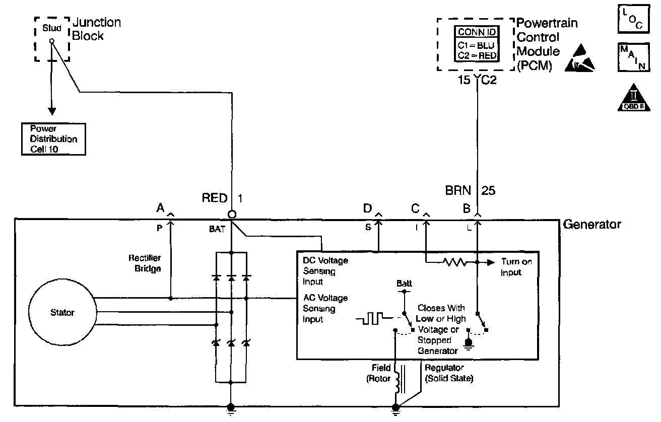^ A generator fault, such as a shorted output diode, malfunctioning regulator, open or shorted rotor, or open sense lead or battery feed may cause a low battery charge. Refer to Charging System Test in Starting and Charging for further information and generator diagnosis. Testing and Inspection