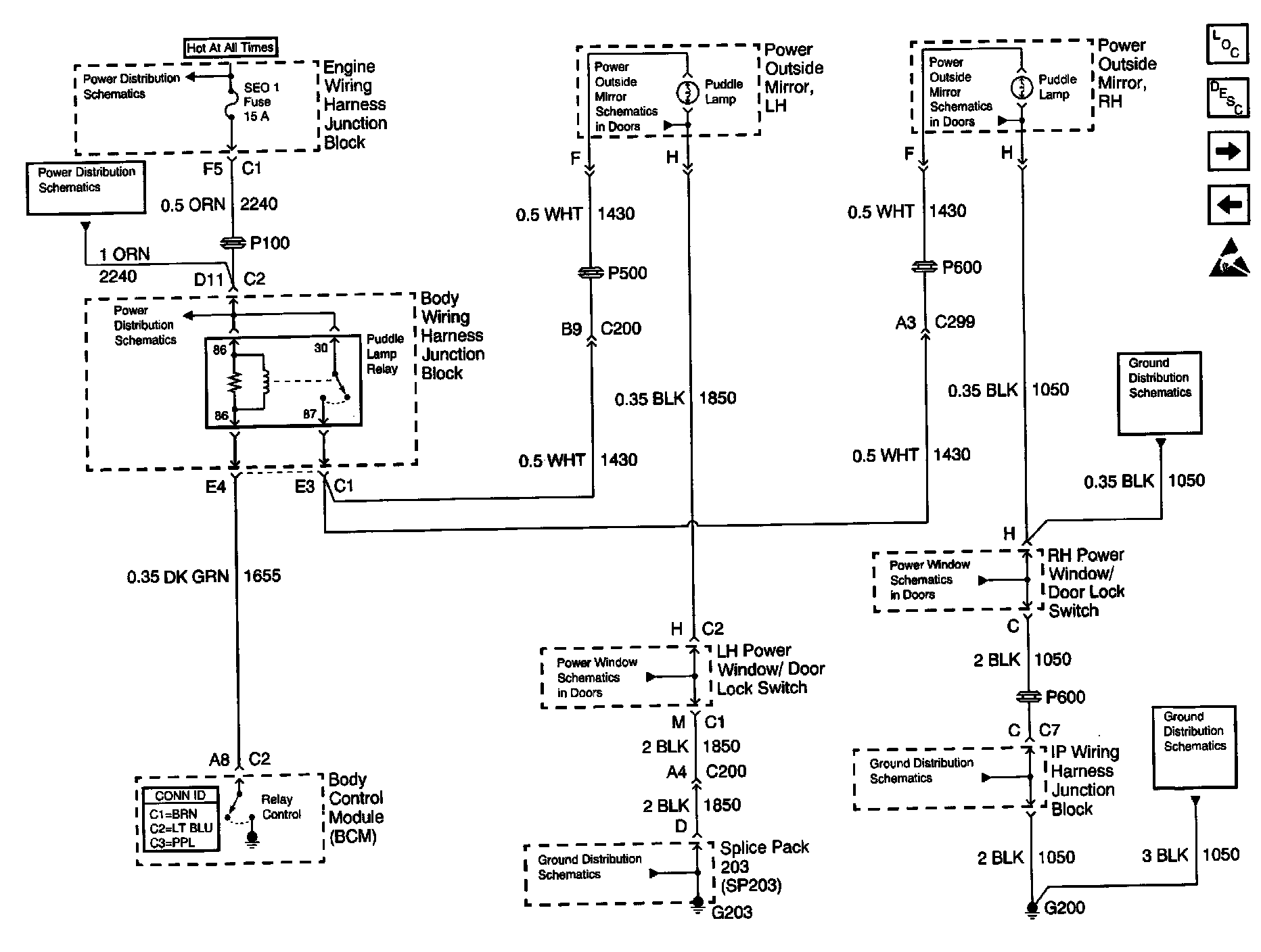 Body Control Module Schematics: Puddle Lamp Relay, Puddle Lamps, SE001 Fuse, G200, SP203: