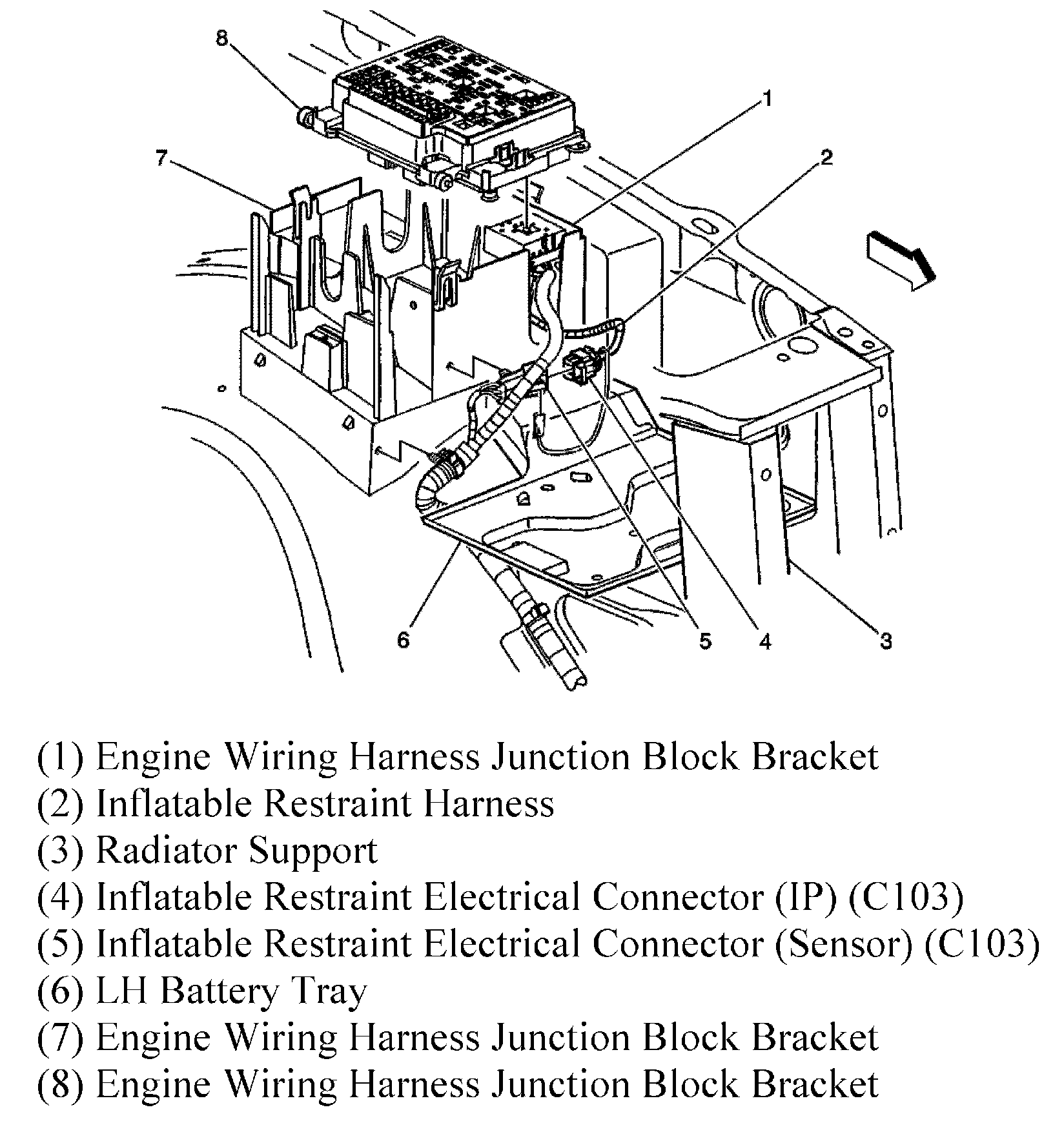 The Fuel Pump Relay is located in the Engine Wiring Harness Junction Block. The Engine Wiring Harness Junction Block is located at the left side of the engine compartment near the battery.