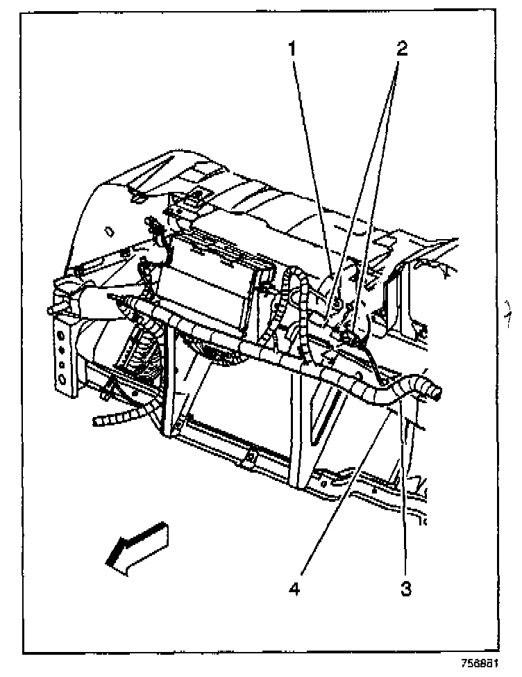 3. Connect the passenger side inflator module yellow 2-way connector (2) to the vehicle harness yellow 2-way connector. Install the CPA and position the retaining clip into the cross-vehicle bar (4).
