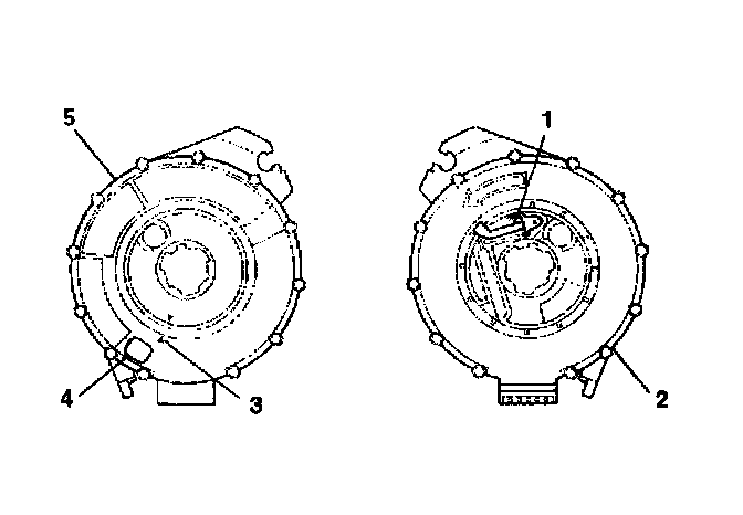 2. If the front (5) of the inflatable restraint steering wheel module coil has a centering window (4), and on the back side (2) a spring service lock (1), perform the following steps: