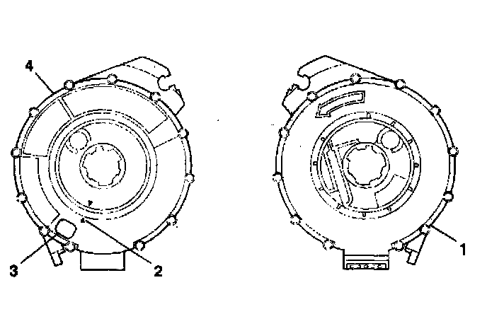 3. If the front (4) of the inflatable restraint steering wheel module coil has a centering window (3) and no spring service lock on the back side (1), perform the following steps: