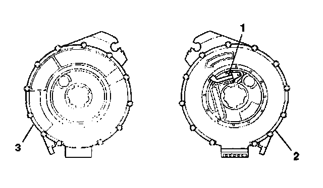 4. If no centering window is present on the front side (3) of the inflatable restraint steering wheel module coil, but a spring service lock (1) is on the back side (2), perform the following steps: