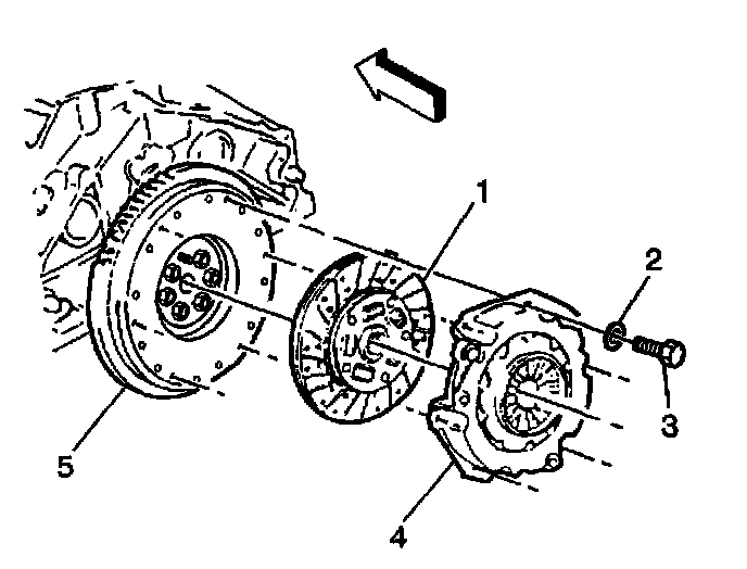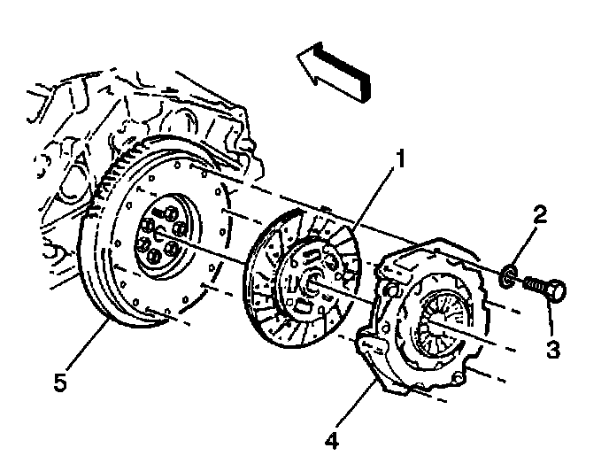 1. Install the bolts (3) and the washers (2) securing the clutch pressure plate (4) and the clutch driven plate (1) to the flywheel (5).