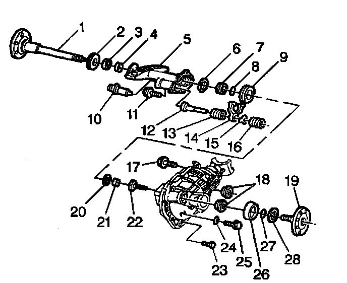 4. Attach a slide hammer with an adapter to the axle shaft (output shaft) (19). Pull the axle shaft from the case.