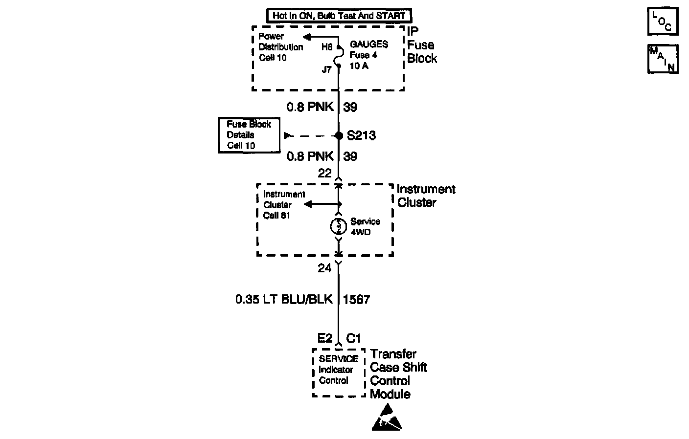 The transfer case shift control module controls the SERVICE indicator (AWD/4WD) lamp, located in the instrument cluster, by grounding the SERVICE Indicator lamp control circuit. Voltage to the lamp is supplied via a common GAUGE Fuse, which feeds all of the gauges in the instrument cluster.