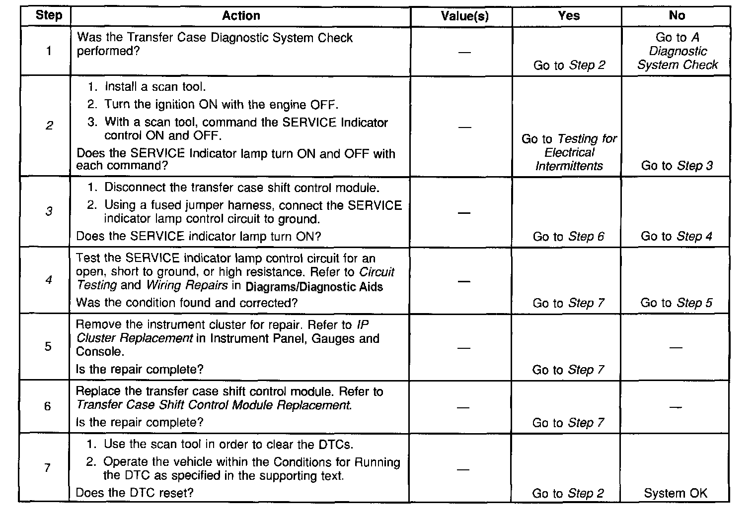 After the transfer case shift control module commands the lamp on, the module senses a voltage greater than 7 V on the SERVICE Indicator lamp output circuit.