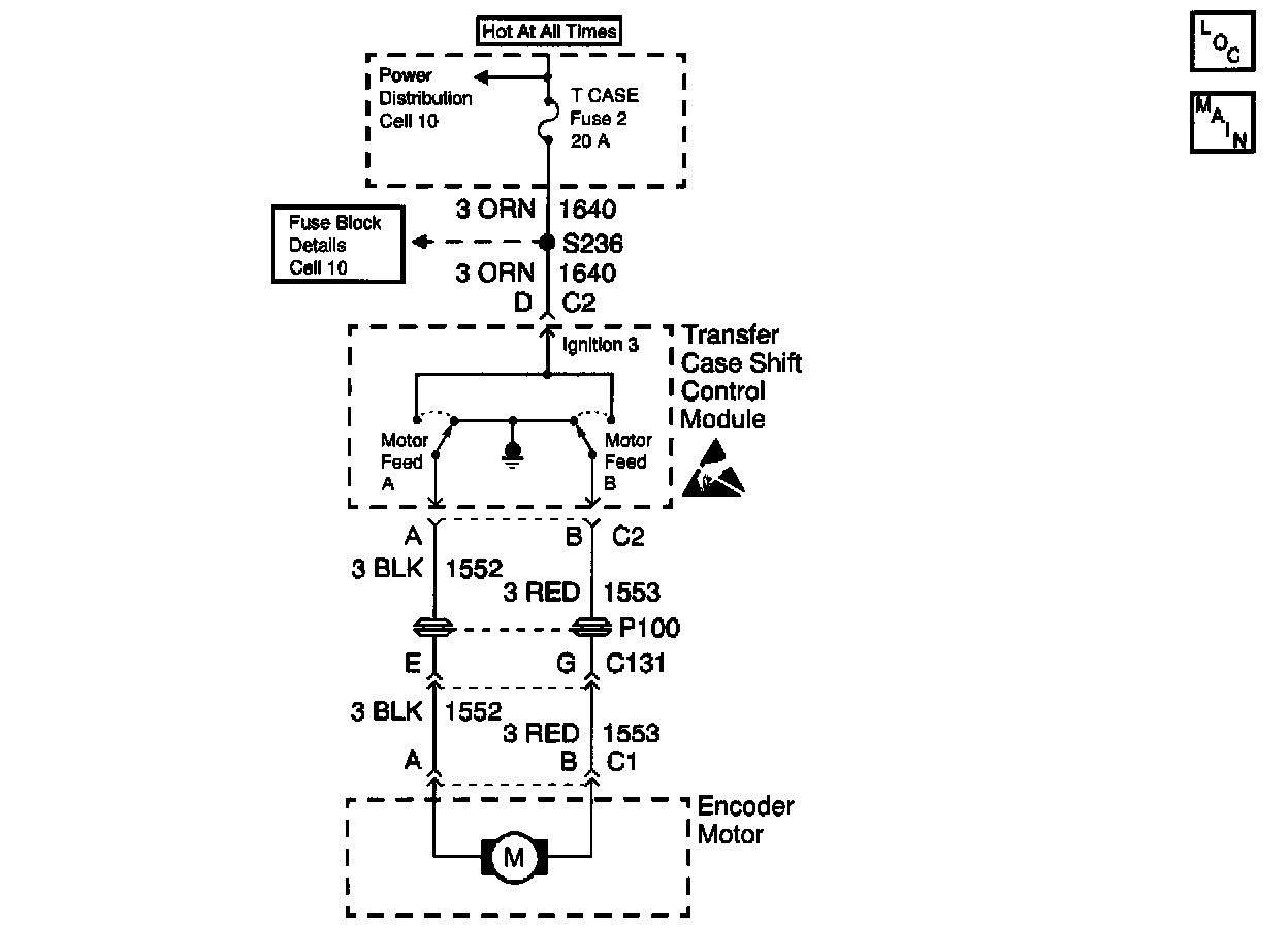 The Transfer Case Motor is a bi-directional, permanent magnet, D.C. motor. When energized, (through Motor Feed A or Motor Feed B, the ground is provided by the opposing Motor Feed circuit and then grounded through the transfer case shift control module ground circuit), the motor, through a series of gears, rotates a shaft which moves the mode and range forks to shift the Transfer Case between 4H, AUTO 4WD, 2H, N, and 4L ranges.