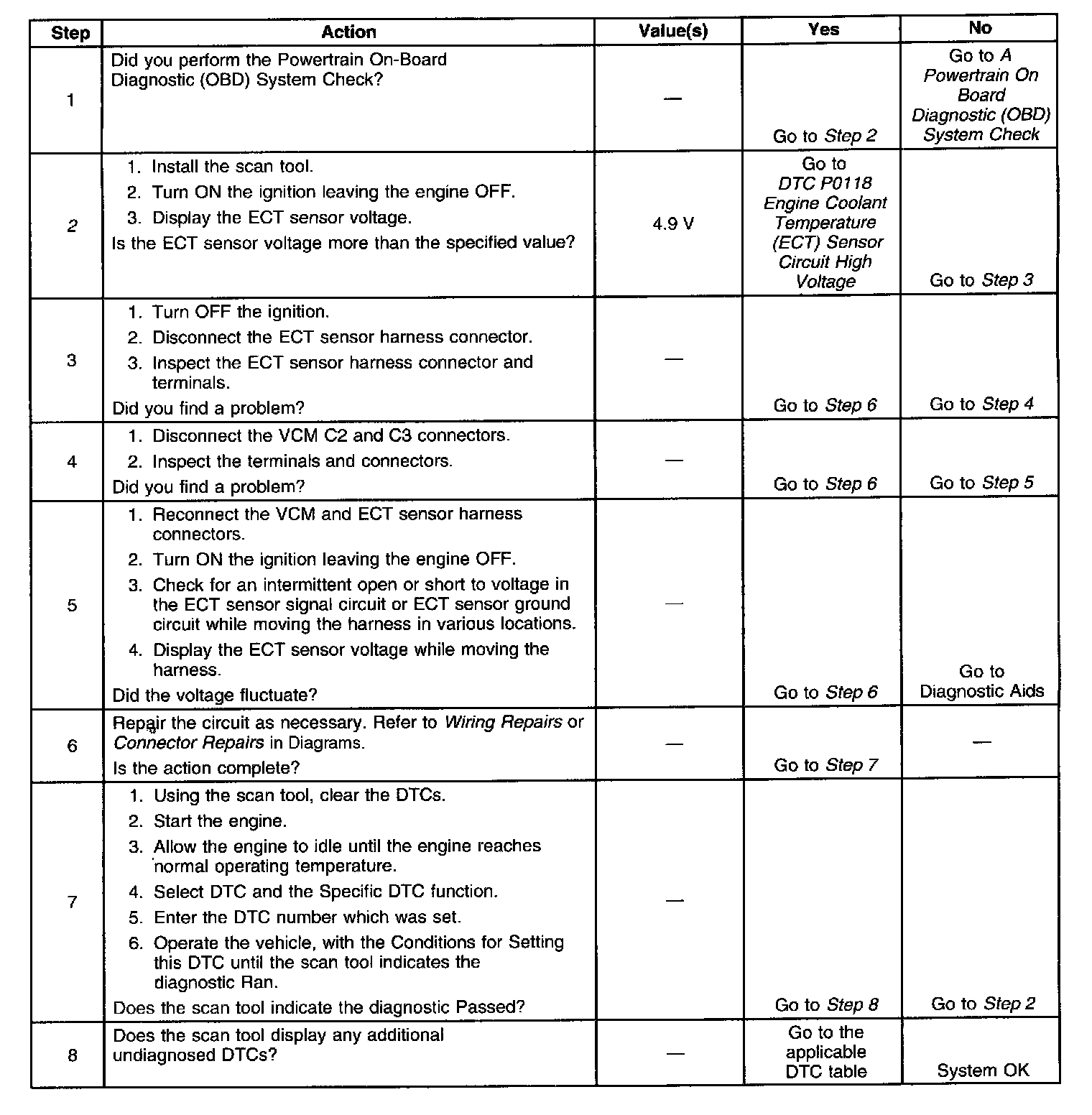2. If the ECT sensor voltage is more than 4.9 volts then the condition is present. Even though DTC P0118 did not set, this DTC is more comprehensive and may aid in diagnosis.