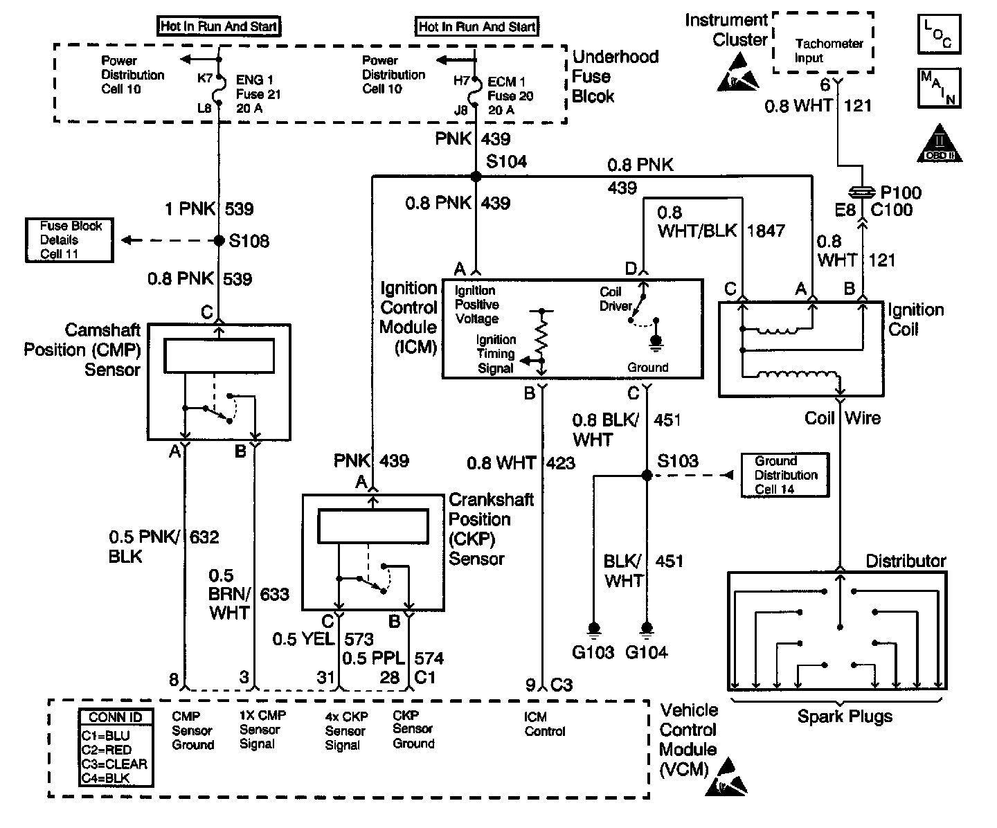 The enhanced ignition system uses the Crankshaft Position (CKP) sensor in order to provide a timing input to the control module. Ignition Control (IC) spark timing for each cylinder based on this input. The control module provides the ignition timing signal to the Ignition Control Module (ICM) to control the ignition coil. Each timing pulse detected by the ICM allows it to energize the ignition coil. A large secondary ignition voltage is induced in the secondary coil by the primary coil. This high voltage is switched to the correct spark plug by the distributor.