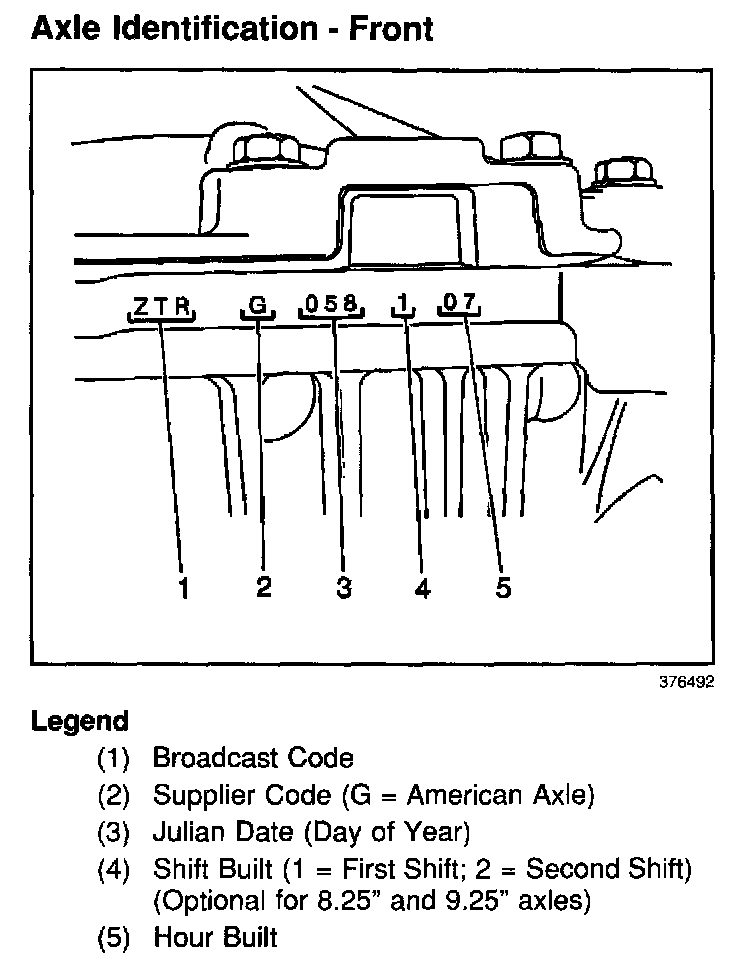 Front axle identification information is stamped on the top of the differential carrier assembly.